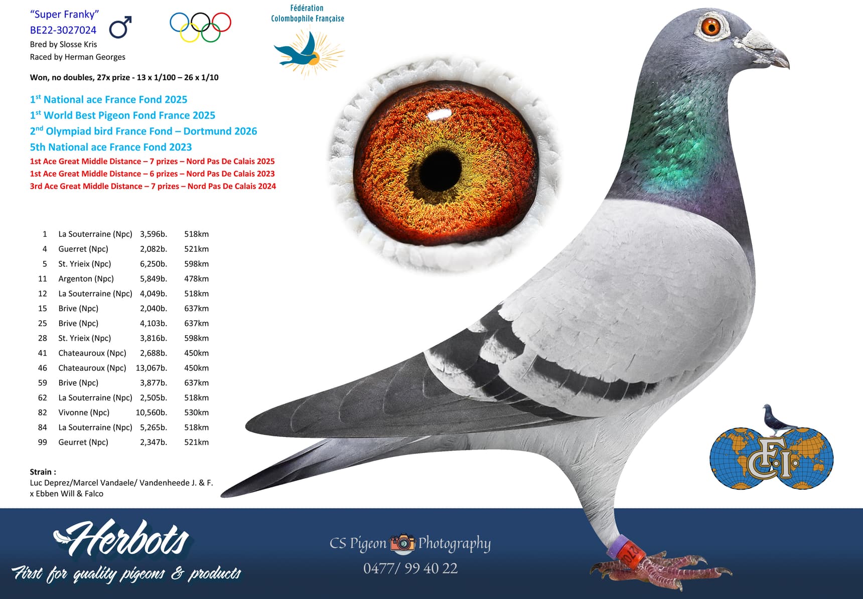 “SUPER FRANKY” is een duif gekweekt door Kris Slosse uit Rekkem (België), en zijn palmares is buitengewoon te noemen. De lijst met zijn prijzen is te lang, dus zullen we ons beperken tot alleen de 15 beste "top 100" NPC-klasseringen:
