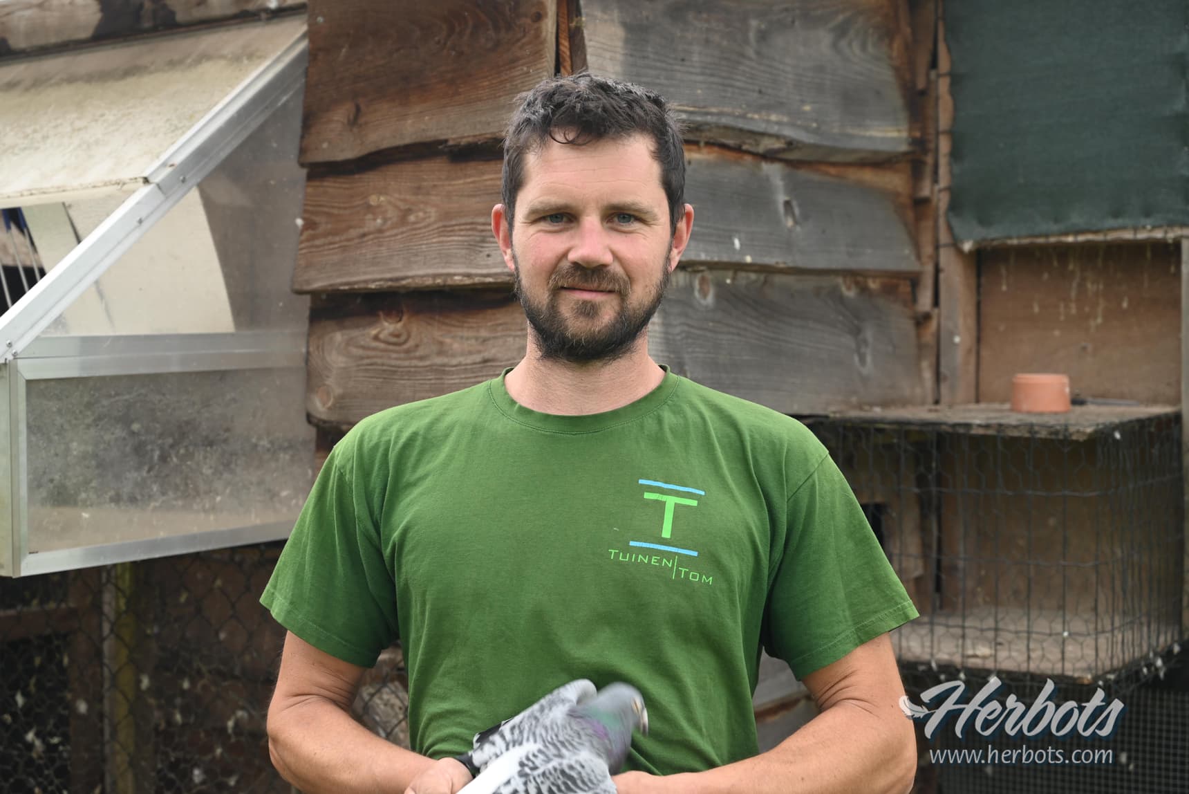 Tom (geboren in ’87) is zelfstandig tuinaanlegger en dan is er van veel vrije tijd weinig sprake. De dagtaak start vroeg en op een extra uur werken wordt er niet gekeken want het jonge gezin heeft nog heel veel plannen qua verbouwingen aan hun aangekochte huis, dus elk extra budget is welkom. Maar een mens heeft ook ontspanning nodig en deze vindt Tom in onze zo geliefde duivensport. Wie Tom kent weet dat hij niet van half werk houdt en daarom koos hij ervoor om zich te concentreren op het spel met de duivinnen. Hier geen weduwnaars en de 65 jonge duiven worden enkel zeer goed geleerd. Enkele snelheidsvluchten en indien mogelijk enkele halve fondvluchten is de enige ervaring die ze in hun 1e levensjaar opdoen.