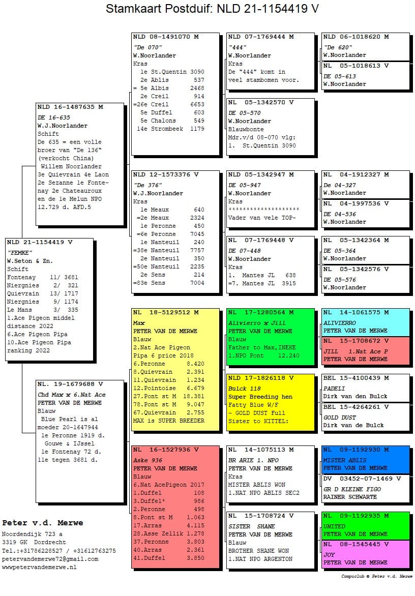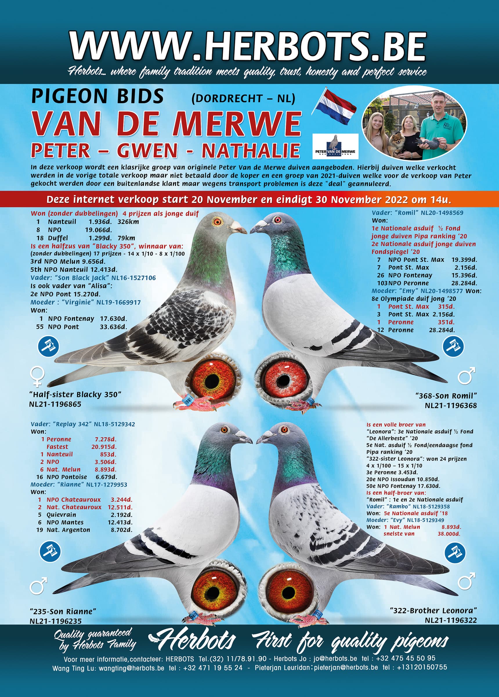 Begin december 2021 was er de succesvolle verkoop van Peter Van de Merwe. Voor de start van de verkoop werd duidelijk gesteld dat er nog enkele oudere en enkele jongere duiven van de gekende “zwarte soort” gingen behouden worden en met deze duiven zijn dan vader Arie en dochter Gwen zich gaan bezig houden, dit terwijl Peter volop aan het recupereren was van zijn zware rugproblemen. De ongekende ervaring van opa Arie en het jeugdig enthousiasme van dochter Gwen blijkt de perfecte cocktail voor succes te zijn want het seizoen was nog maar enkele weken oud toen hun duiver "Arie" (NL21-1196123) de 1e NPO Pont St Maxence (snelste van 35.038d.) won en nogmaals enkele weken later was top duivin "Janne" (NL21-1196134) die de NPO zege tegen 3.934 duiven vanuit Chateauroux naar huis bracht. "Janne" was tevens de snelste van 5.369d.