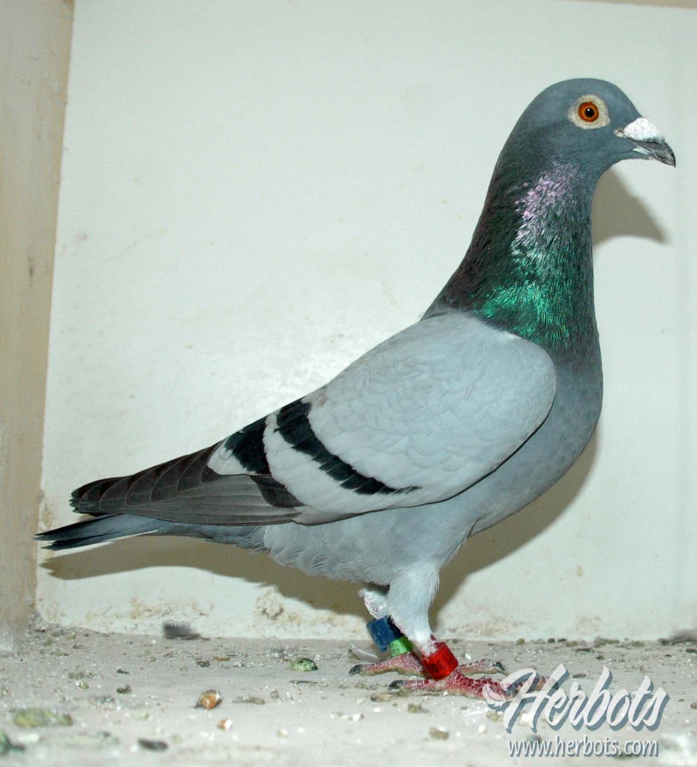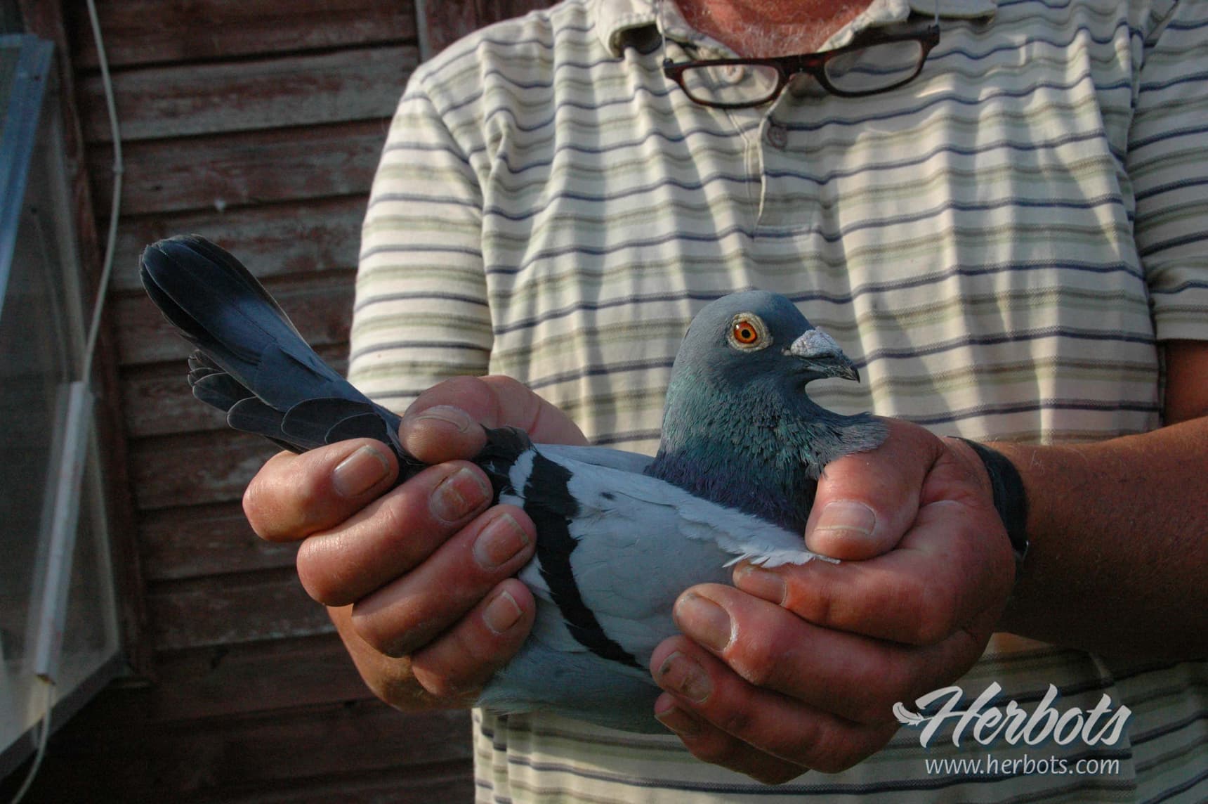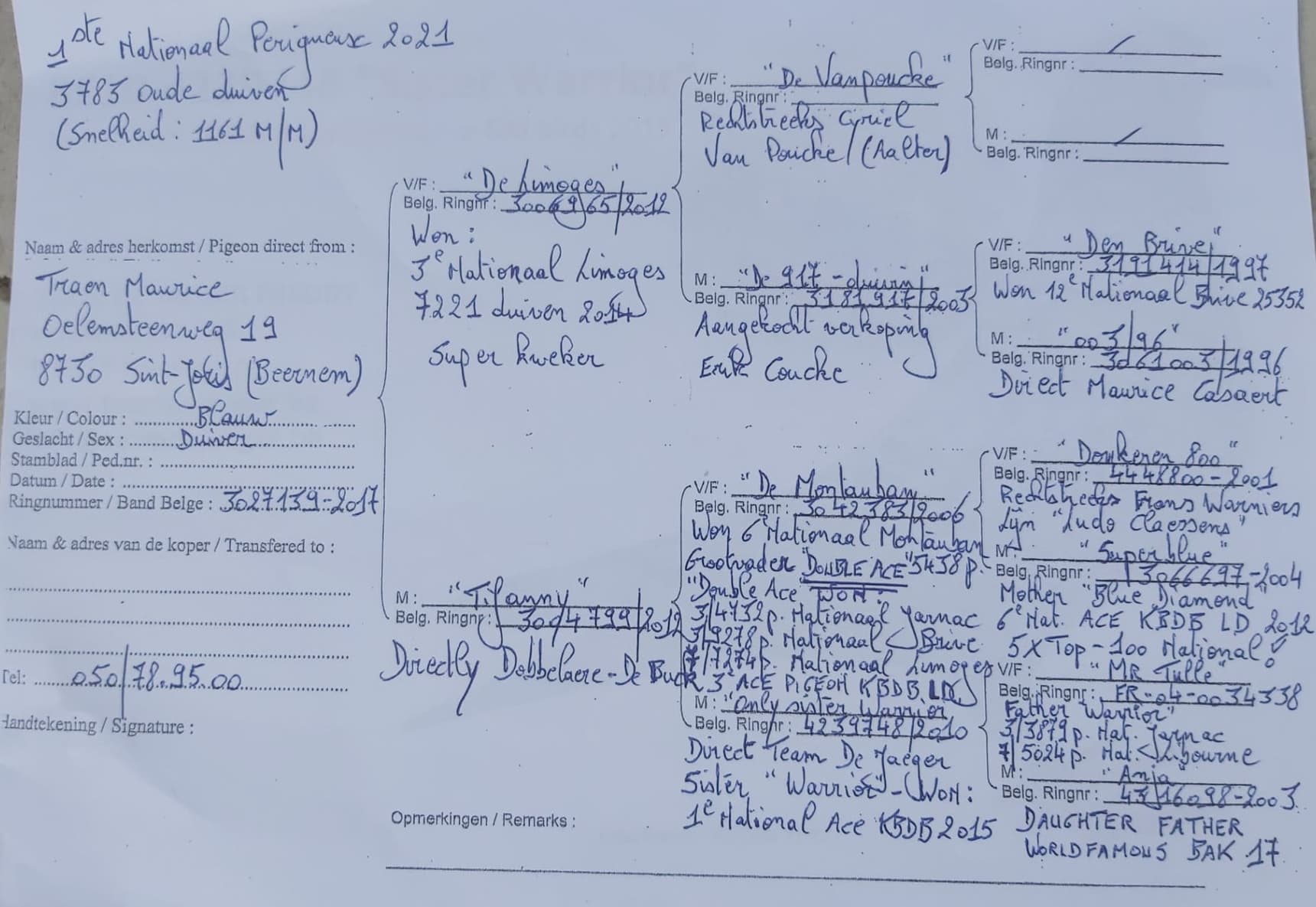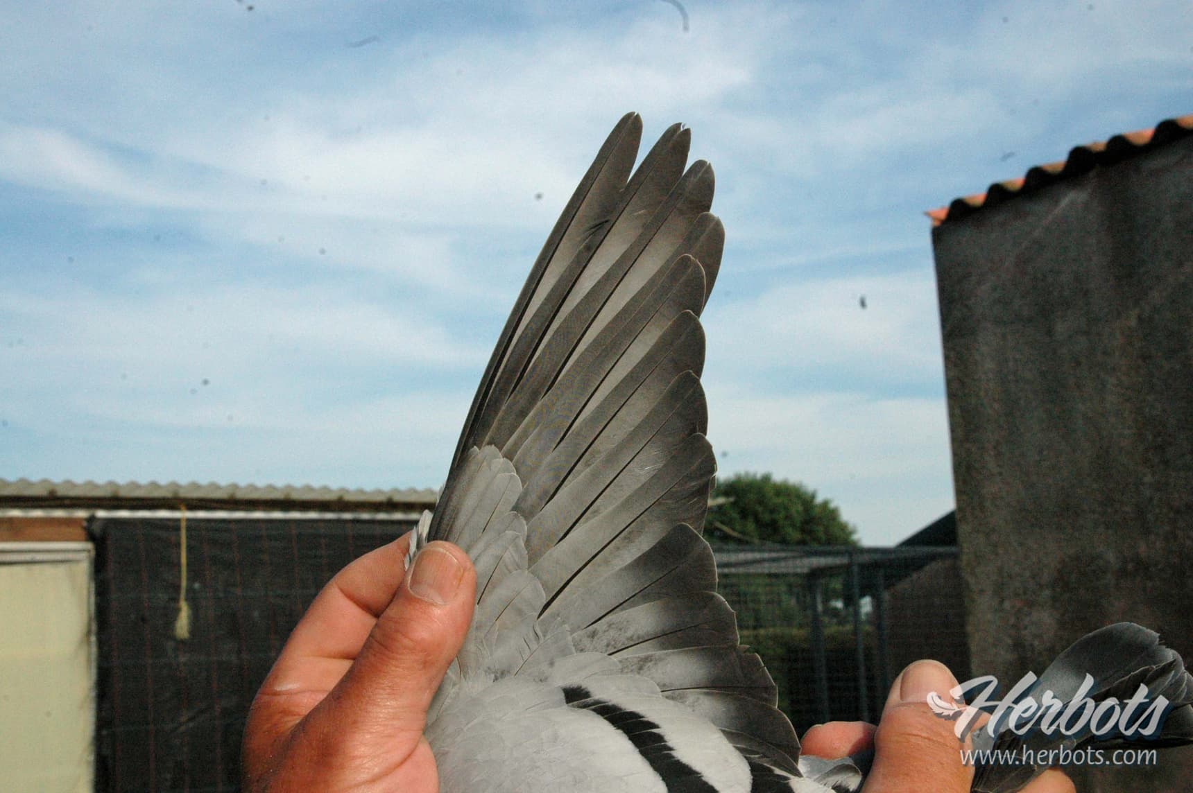 In totaal werden er 8.562 duiven voor deze nationale fondvlucht ingekorfd en met een stevige noordoosten wind als reisgezel was het te verwachten dat de snelste duiven in de provincie West-Vlaanderen zouden geklokt worden. Snelste van alle Perigueux vliegers werd blauwe duiver “B17-3027139” die na zijn exploot de naam “De Perigueux” op gekleefd kreeg. Met een gemiddelde snelheid van 1161.71 m/m liet hij zijn baasje Maurice Traen van een eerste nationale overwinning proeven. “De Perigueux” is middelmatig van bouw en van het zeer zenuwachtige type. We hadden meerdere pogingen nodig om hem te kunnen fotograferen. Ongelofelijk hoe “zot” hij achter zijn duivin liep.