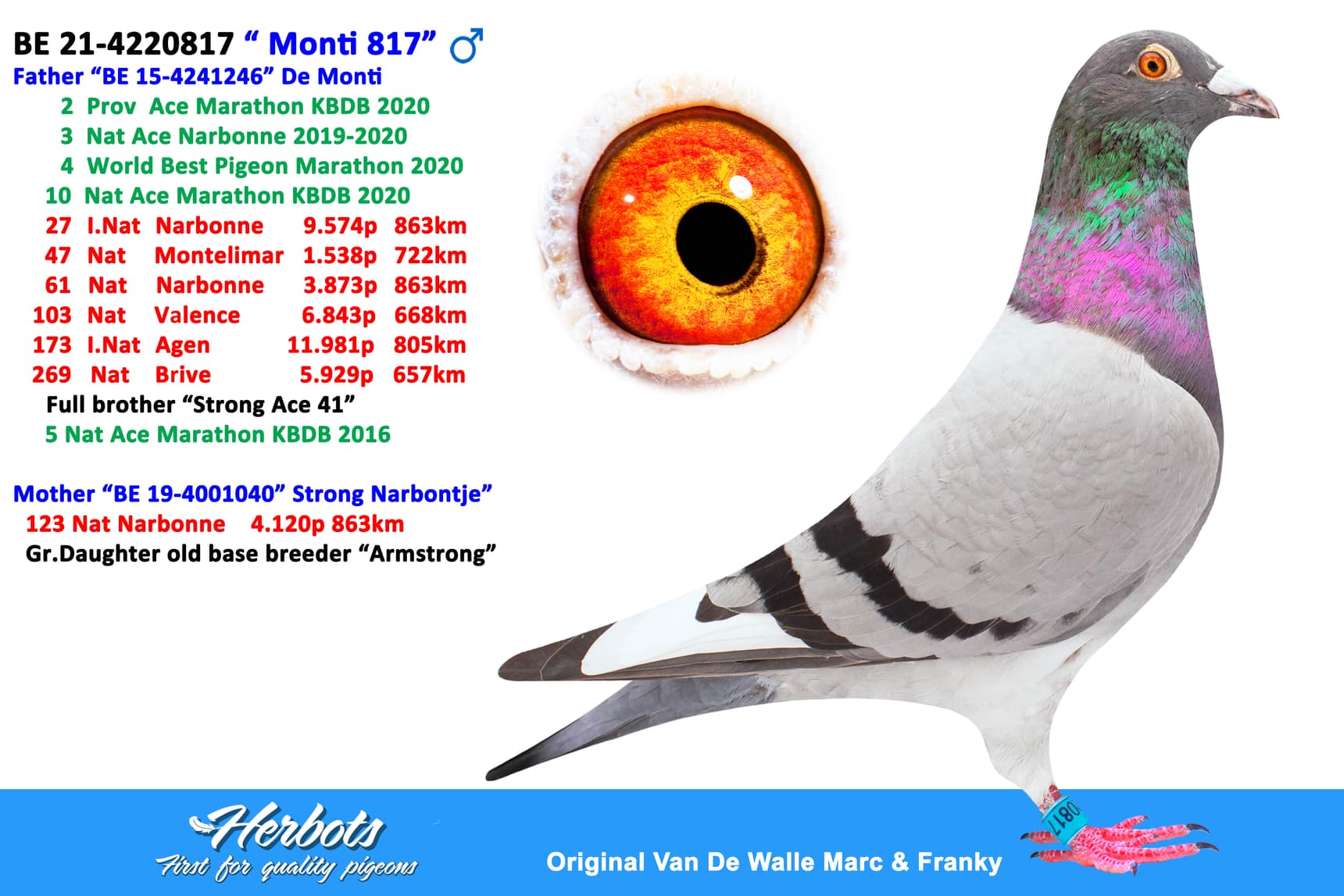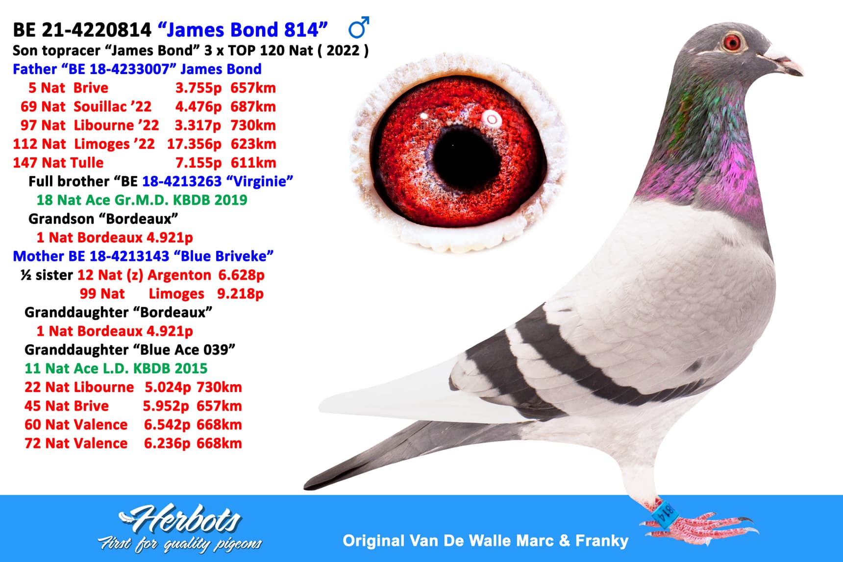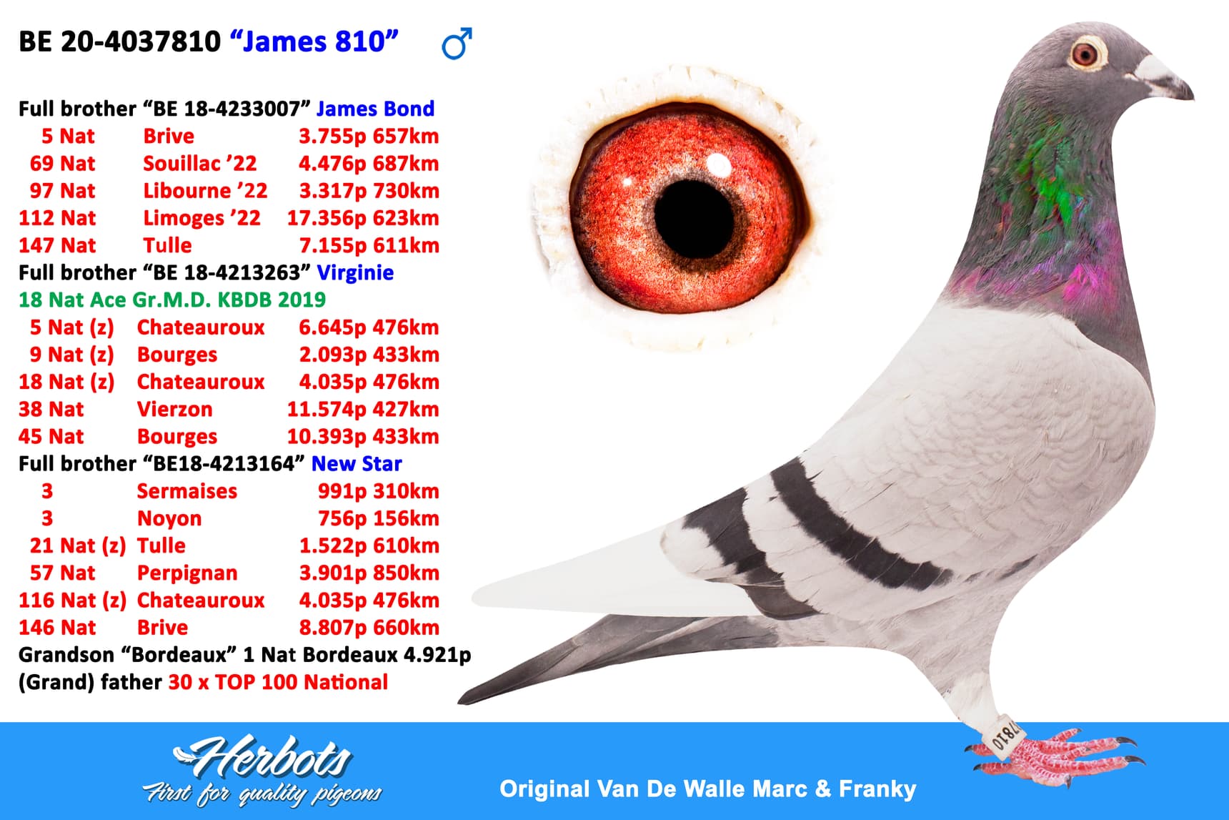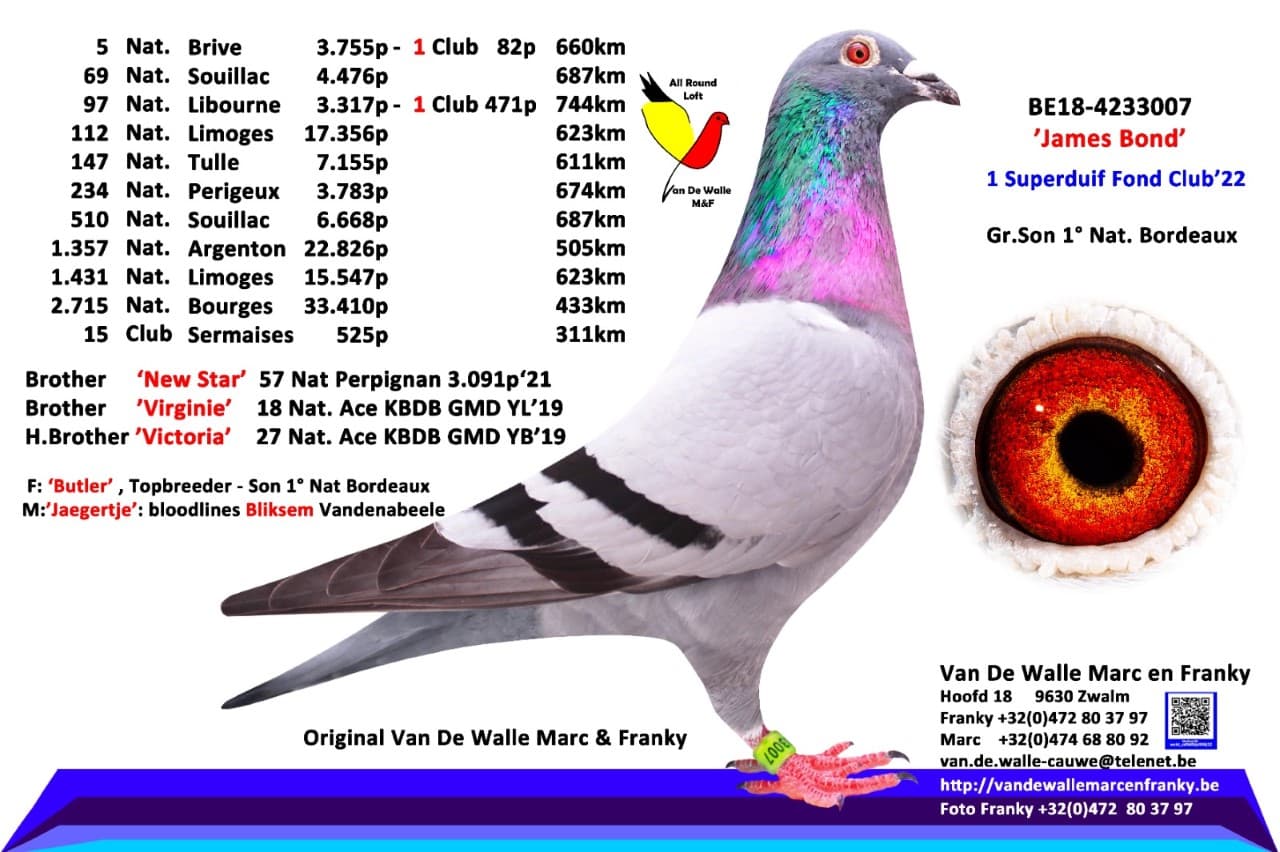 Dit is dan weer een volle broer van supersterren “James Bond” en “Virginie”. Maar daarnaast ook van “New Star” die 57ste Nationaal Perpignan won tegen 3.901 duiven en 146ste Nationaal Brive tegen 8.807 duiven. Hij won op de kortere vluchten van Noyon en Sermaises 2 x de 3de prijs tegen 700 en 900 duiven. Ofwel pure all round superklasse van 100 tot 900km… waar vind je zulke duiven nog.