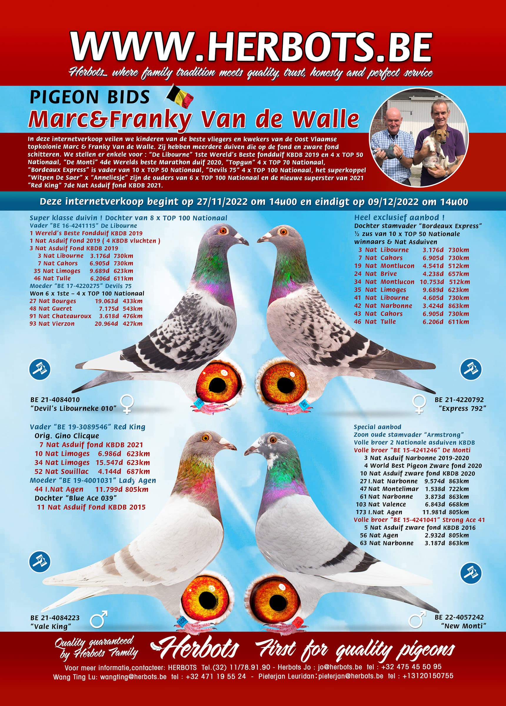 De topkolonie Marc & Franky Van de Walle uit het Oost Vlaamse Zwalm speelt met hun fondduiven op alle terreinen en zijn in het bezit van enkele toppers die meerdere keren Top 100 Nationaal vlogen. Pure klasse wat deze 2 broers uit hun hoed toveren en hoe ze al meerdere jaren super presteren van halve fond tot zware fond. Fondduiven die op 200 of 300km niet present zijn, daar houden ze niet van. Liever duiven die het overal doen en liefst TOP NATIONAAL vliegen. Ze hebben er de duiven voor en ook de kwaliteit druipt er gewoonweg vanaf als je hier de beste duiven door je handen neemt.