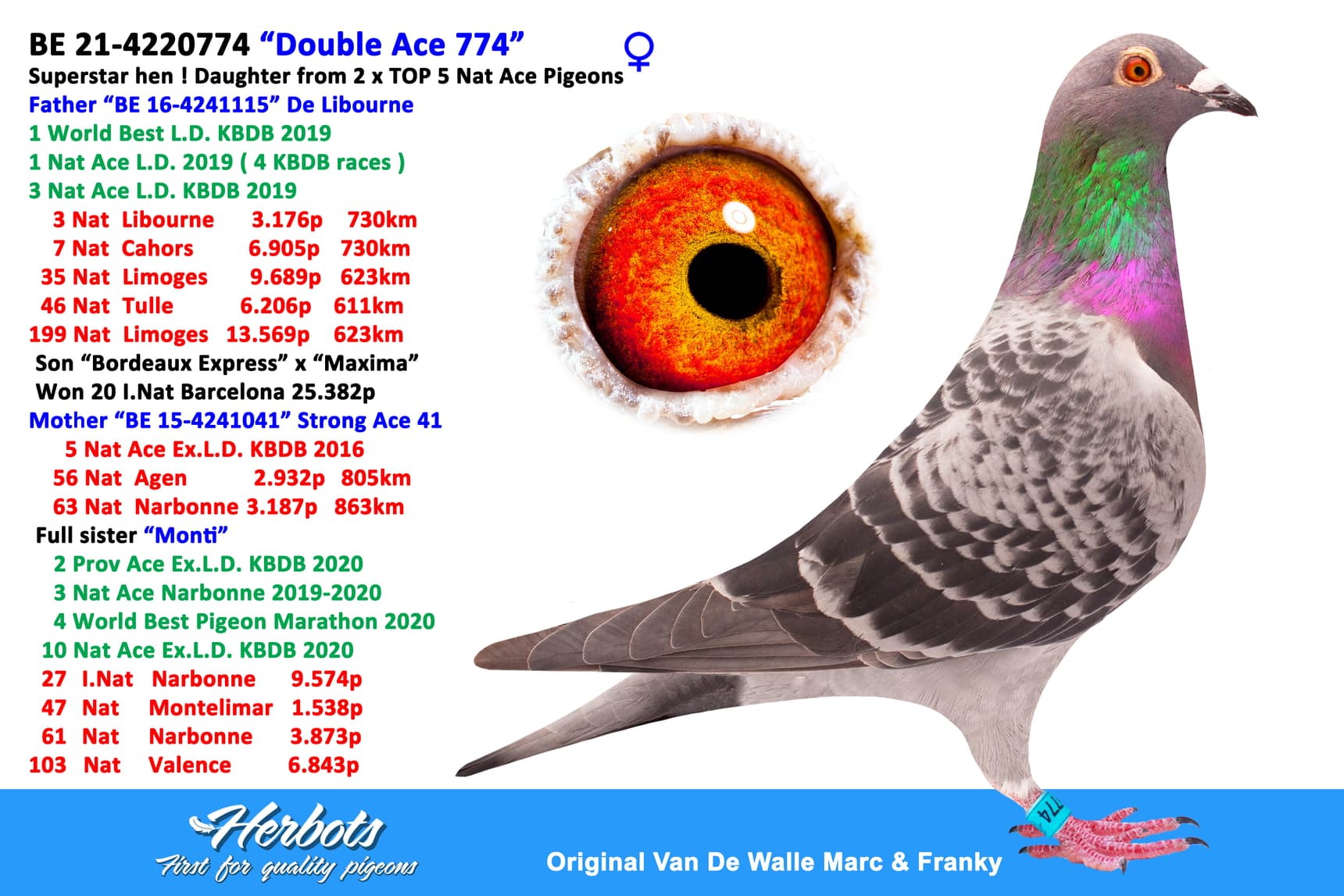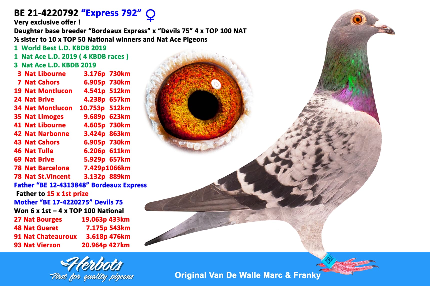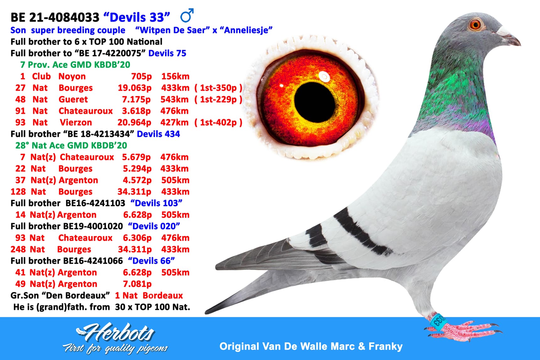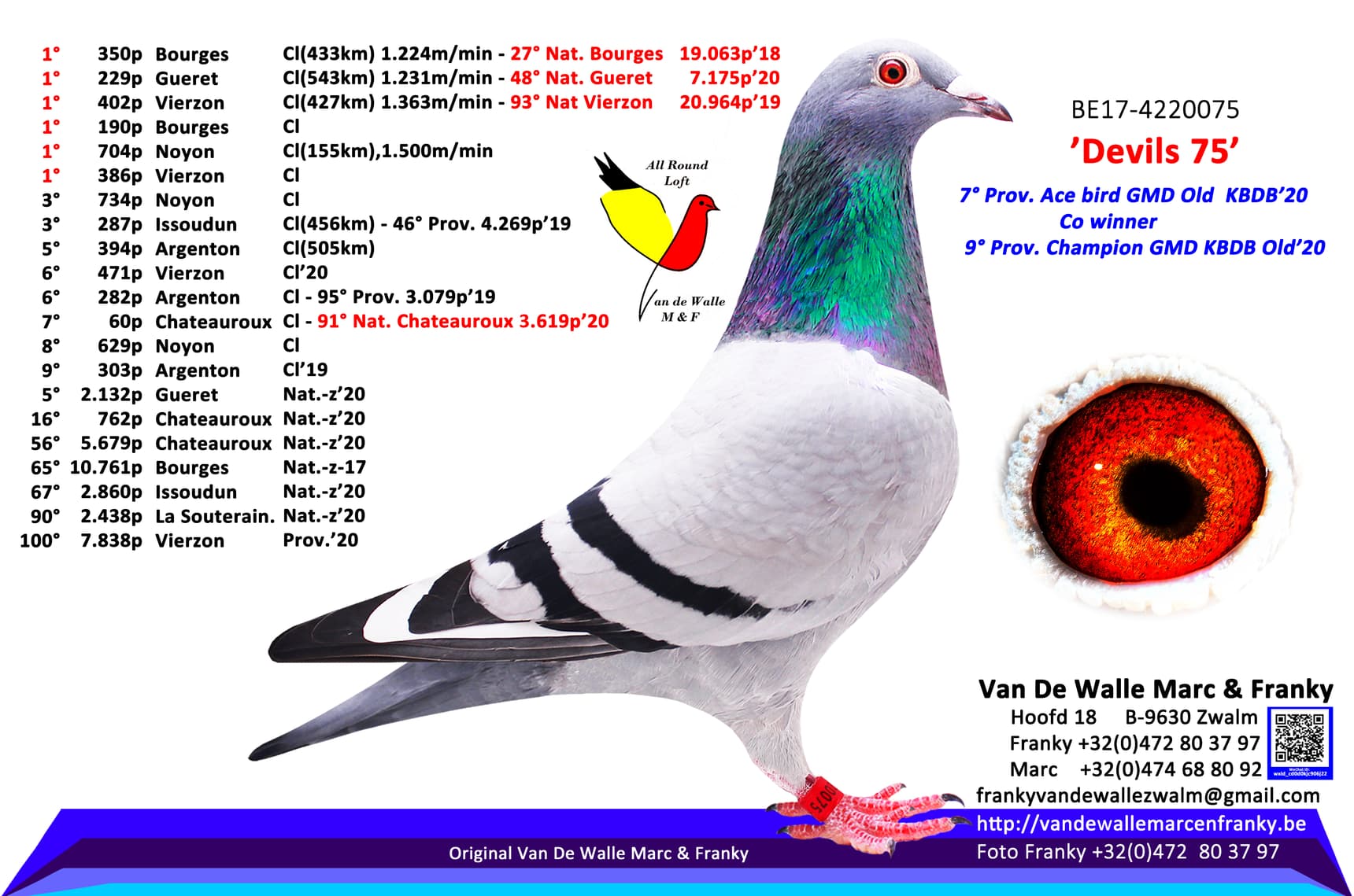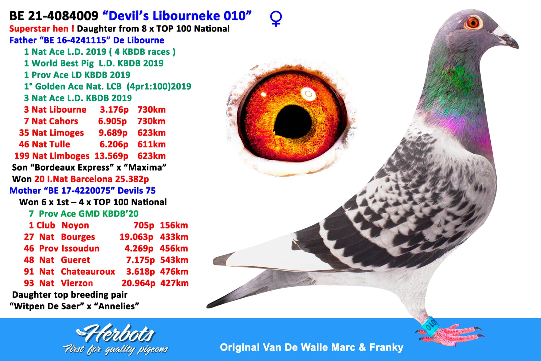 Deze duivin is een dochter van stamvader “Bordeaux Express” die vader is van 10 x TOP 50 Nationale winnaars en vader is van supercrack “De Libourne” en zoveel andere duiven. Hier werd de stamvader gekoppeld aan “Devils 75”. Zij won dan weer 4 x TOP 100 Nationaal in haar carrière op de zware halve fond.