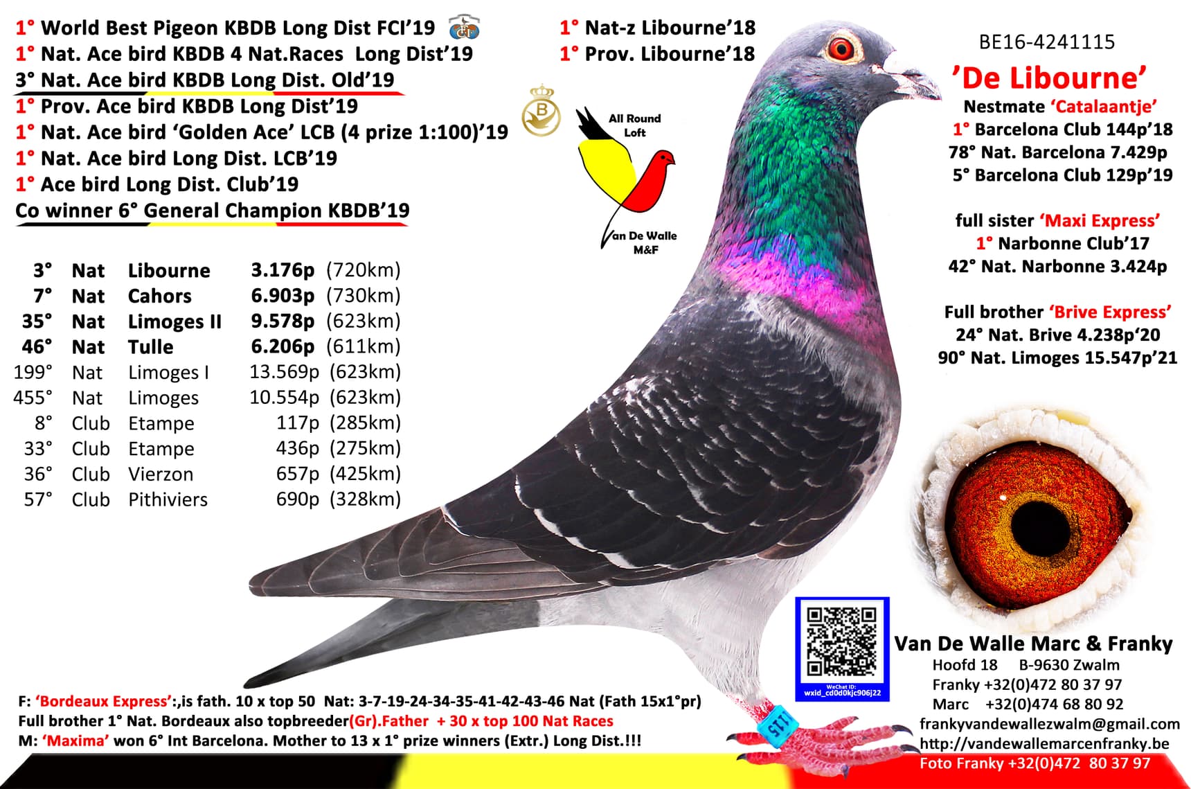 “De Libourne” 4 x TOP 50 Nationaal, 1ste World Beste Fondduif KBDB 2019, 1ste Nationale Asduif fond 2019 ( 4 KBDB vluchten ) en 3de Nationale Asduif fond KBDB in 2019.