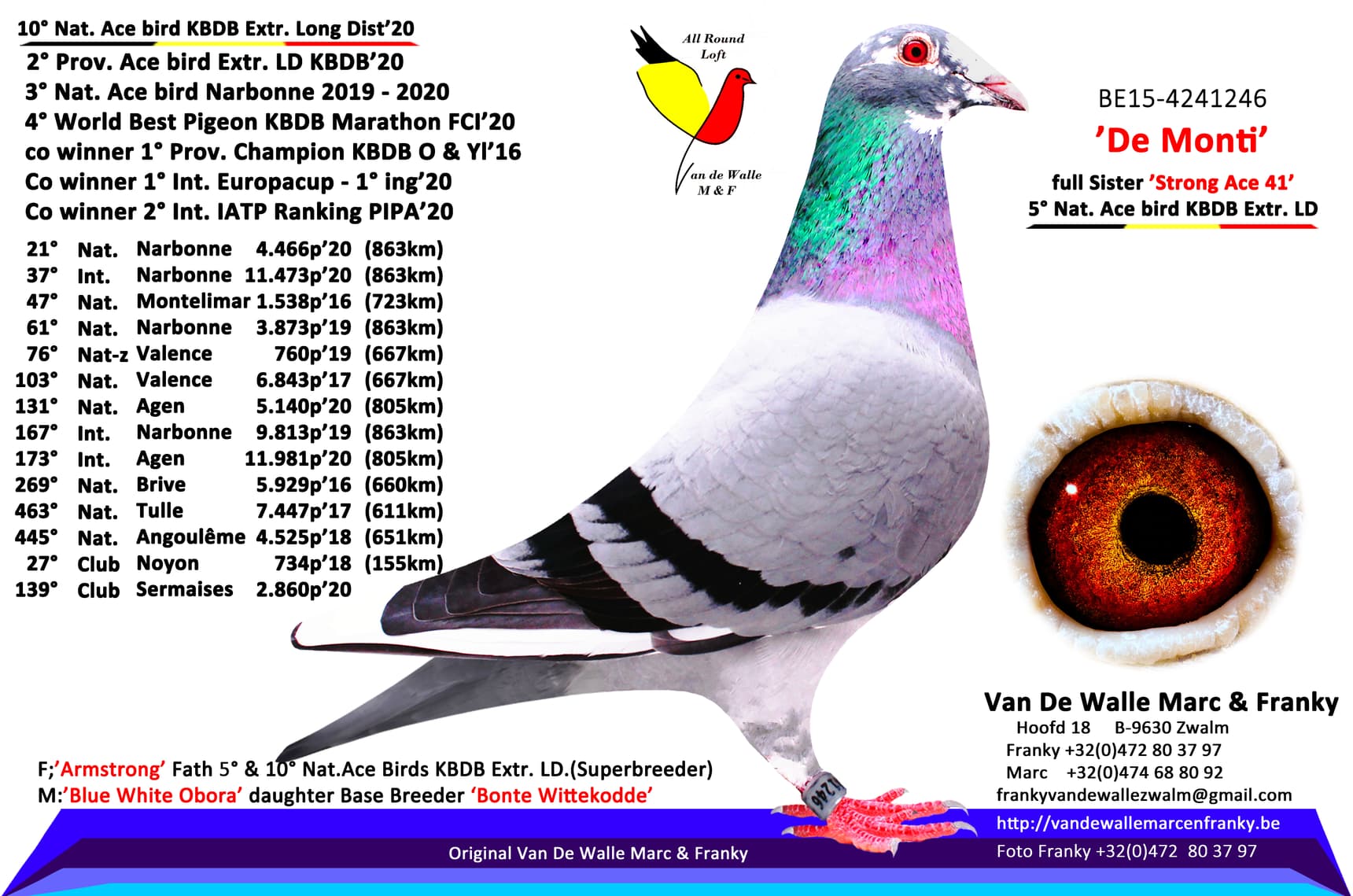 Dochter van “De Libourne” x “Strong Ace 41” 5de Nat Asduif zware fond KBDB en volle zus volgende supercrack “De Monti”. “Strong Ace 41” is op haar beurt nu al moeder van “Mr.Magic” 57ste Nationaal Souillac 4.056 duiven en 175ste Nationaal Perpignan 3.901 duiven.