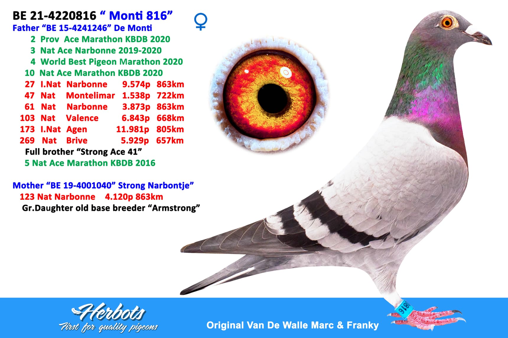 De volgende superster die op 5 jarige leeftijd het mooie weer maakte in Zwalm. Hij won 27ste I.Nat Narbonne 9.574d, 47ste Nationaal Montelimar 1.538d, 61ste Nationaal Narbonne 3.873d en 103de Nationaal Valence 6.843d. Hierdoor werd hij 2de Prov Asduif zware fond KBDB 2020, 3de Nationale Asduif Narbonne 2019-2020 en 4de World Beste Asduif Marathon 2020.