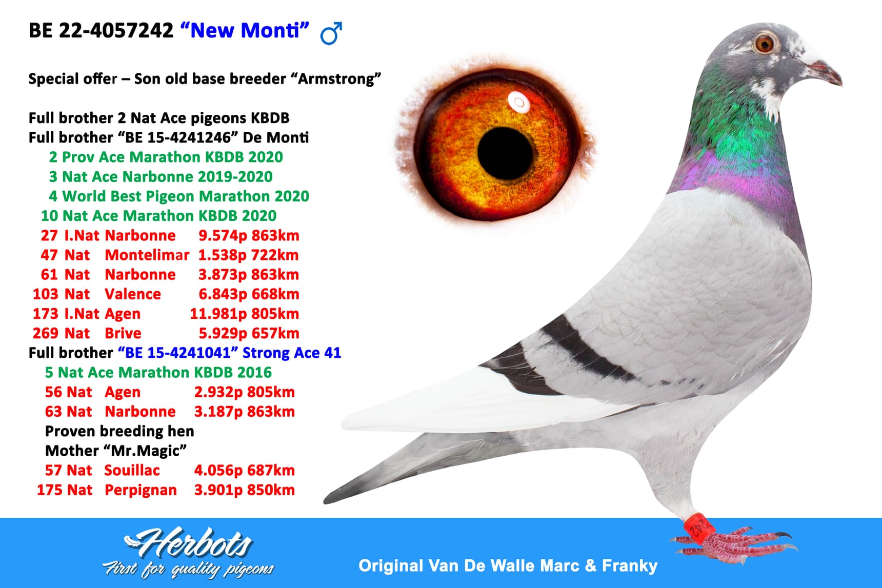 We hebben in dit artikel al gesproken van “Monti” en “Strong Ace 41”. Beide waren bij de Nationale Asduiven op de zware fond en zijn kinderen van oude stamvader “Armstrong” die hier was gekoppeld aan een dochter van “Bonte Wittekode” ( Bordeaux lijn ). Je komt telkens terug naar de dezelfde bron waar zij de mosterd hebben gehaald en waar ze mee lukken.