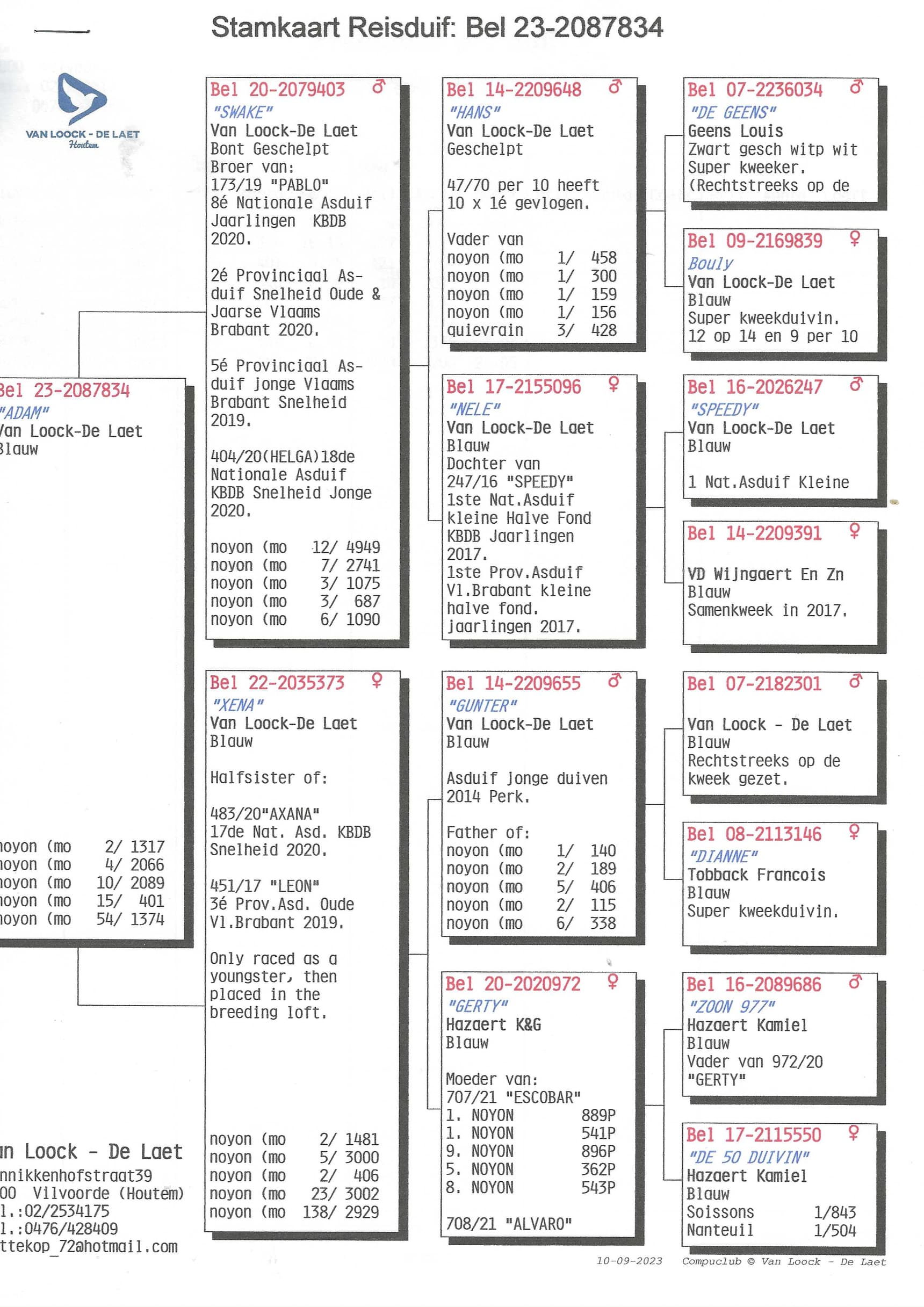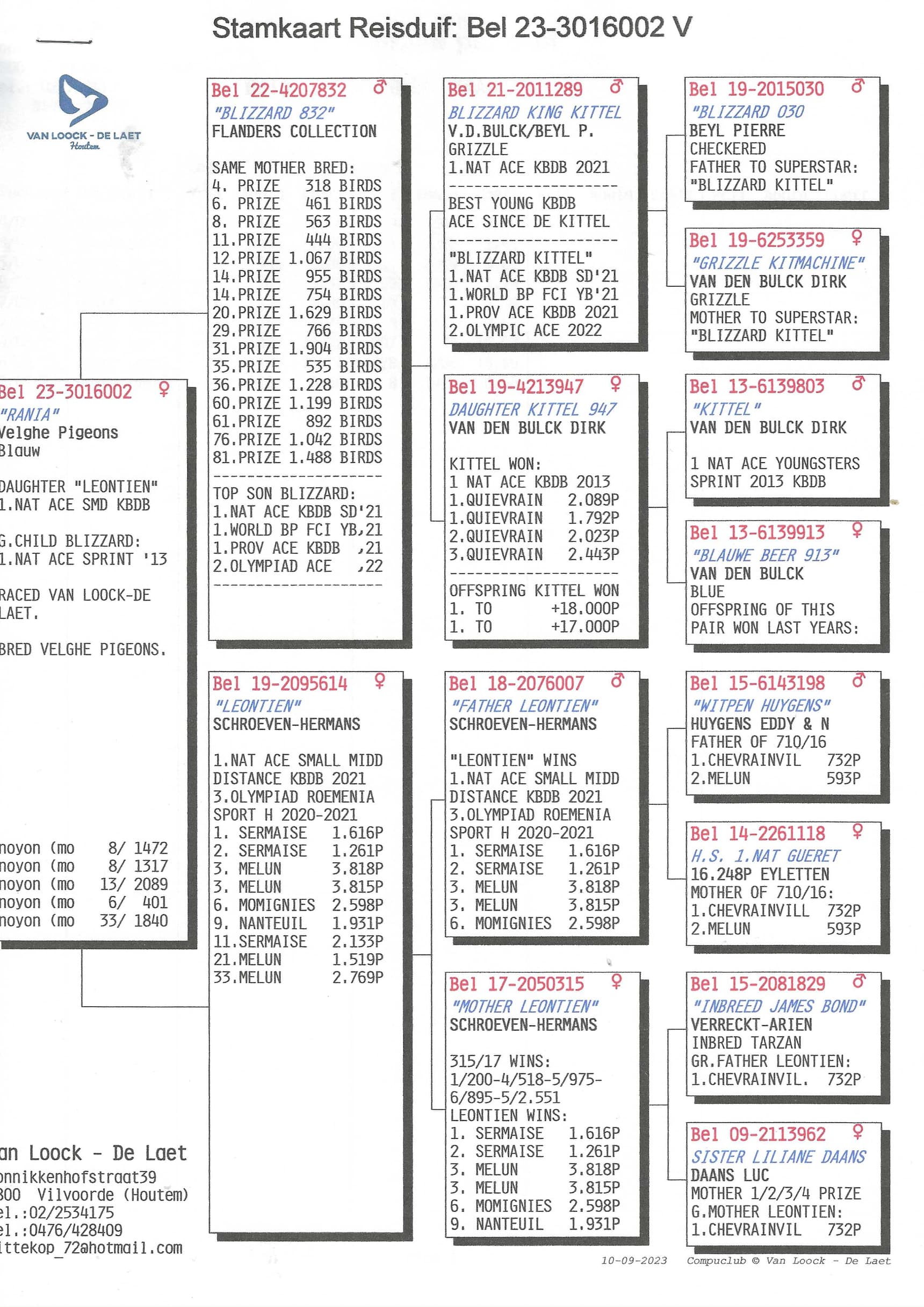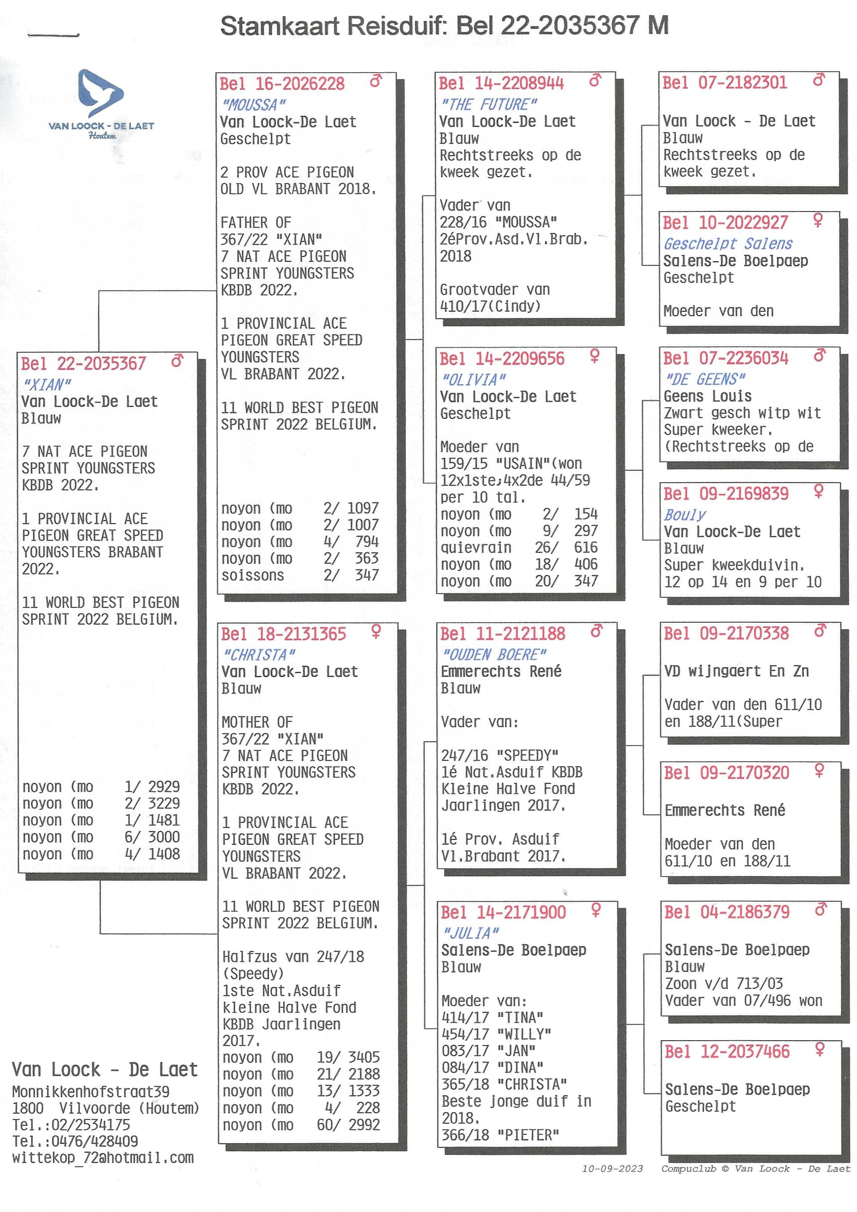 De tandem Van Loock – De Laet uit het Brabantse Vilvoorde beleefden weer een topseizoen op de snelheid. Ze hebben weeral meerdere toppers op de snelheid en werden 6de Nationaal Kampioen snelheid oude en jaarse KBDB 2023. De resultaten op provinciaal gebied zijn ook al binnen op gebied van 1+2 en dit is 2 x 2de en 1 x 3de. De asduiven zijn nog niet gekend dus hier is het nog even op wachten. Er zijn meerdere toppers van vorig jaar die nu opnieuw hun beste kunnen hebben getoond waaronder “Mister V”, de klasbak van Dominique Velghe. Hij werd 4de nationale asduif snelheid jaarse KBDB in 2022 en nu opnieuw schitterde hij met meerdere topresultaten en dan heb je de 2 broers “Xian” en “Xeno” die samen als jonge duif en jaarling top presteerden. Voor Juan en Maurice is dit seizoen opnieuw de bevestiging van hun topkwaliteit op de vlieghokken. De andere nationale asduiven zijn afkomstig uit hun eigen kweekstal en komen uit hun beste lijnen, de basis is er en voor de toekomst zitten ze op rozen.