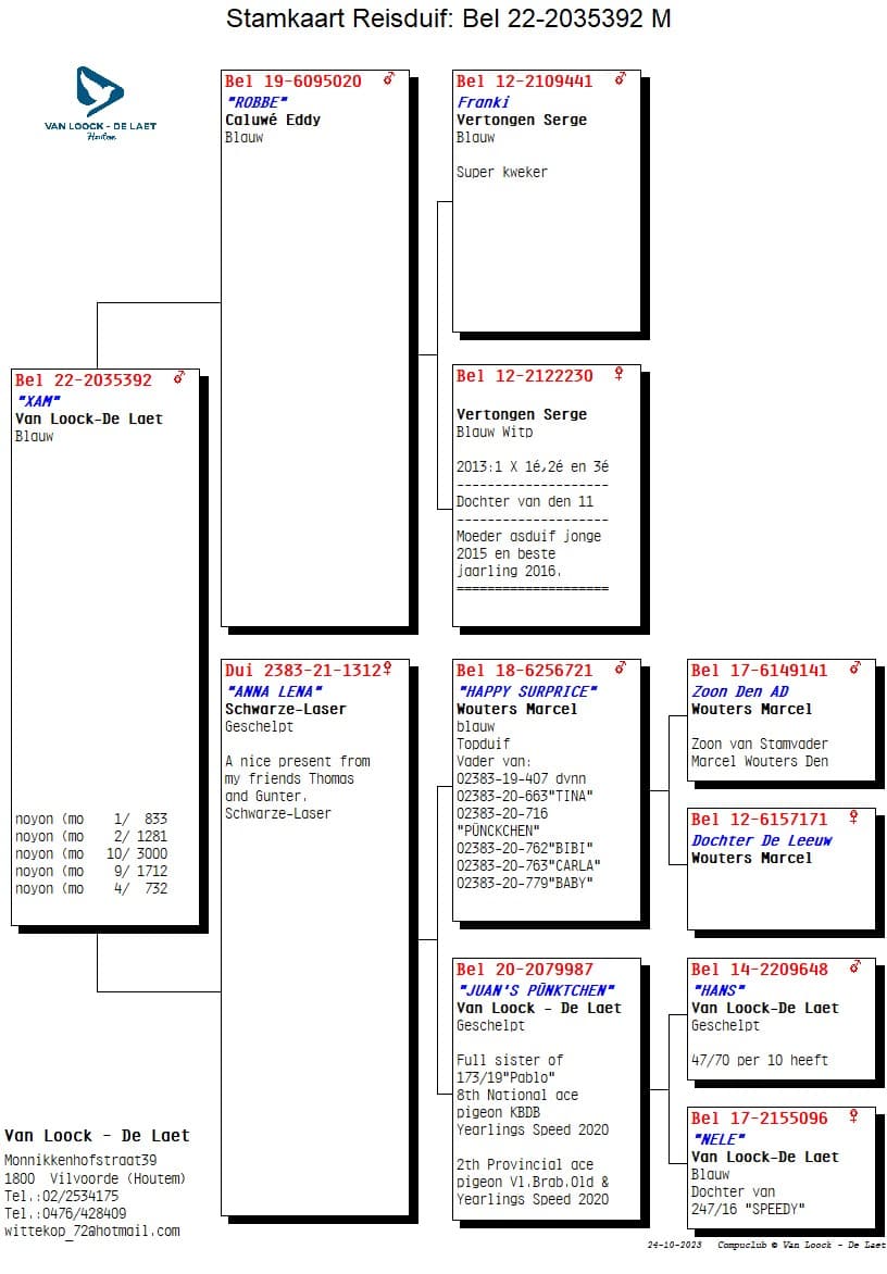 Zoon van “289/21” Blizzard King Kittel Pierre Beyl won 1 Nat Asduif snelheid jonge KBDB 2021 x “947/19” Dochter Kittel Dirk Van Den Bulck 1 Nat Asduif snelheid jonge KBDB 2013