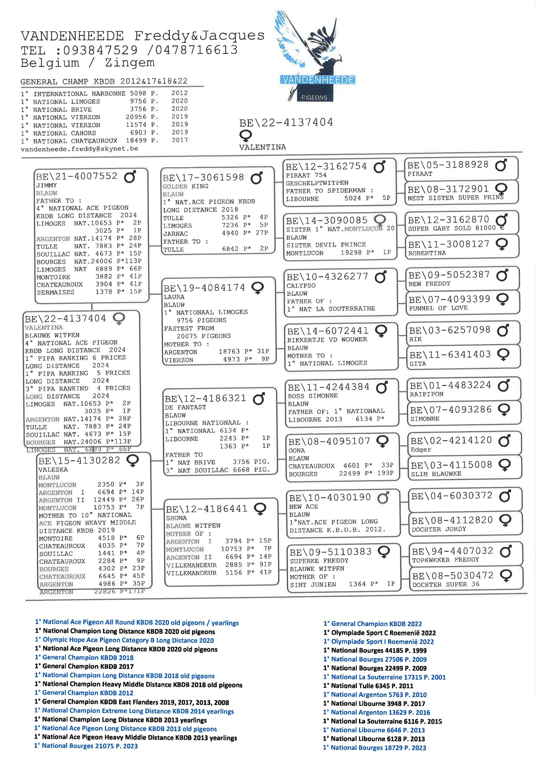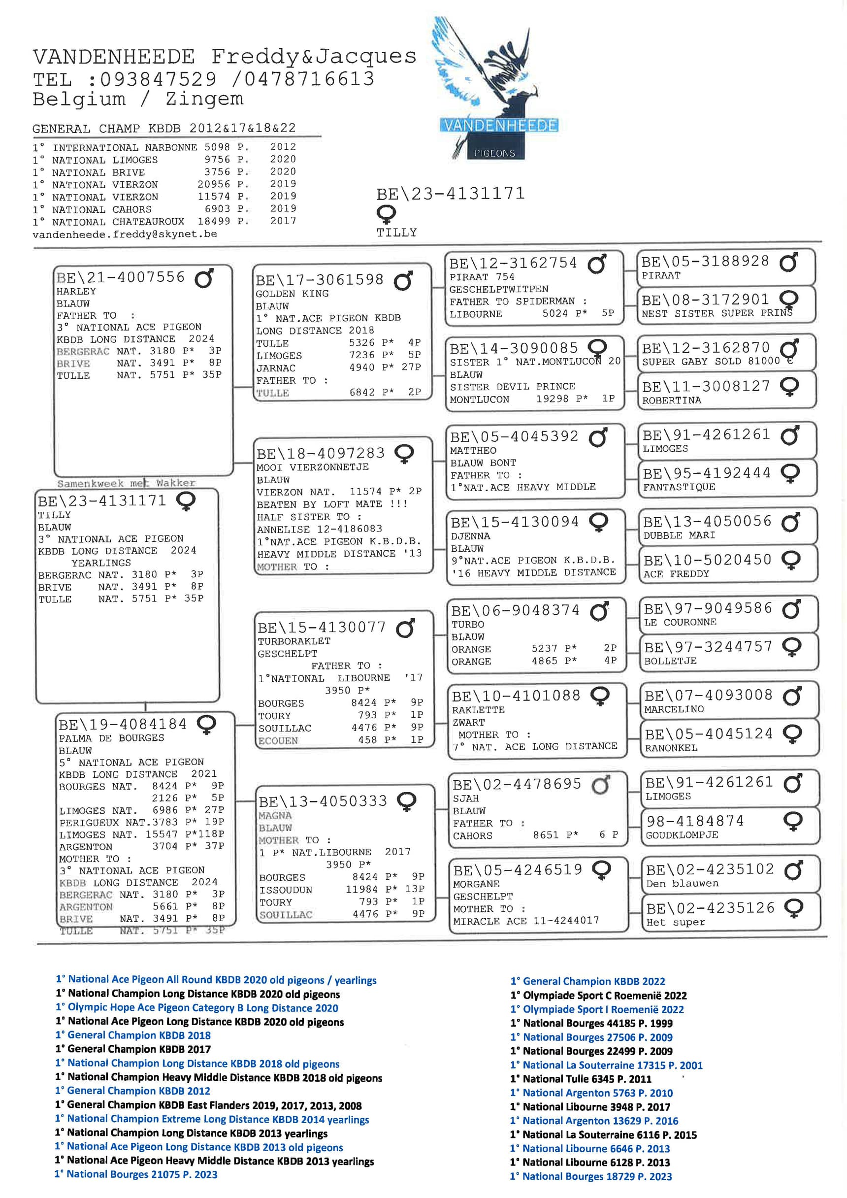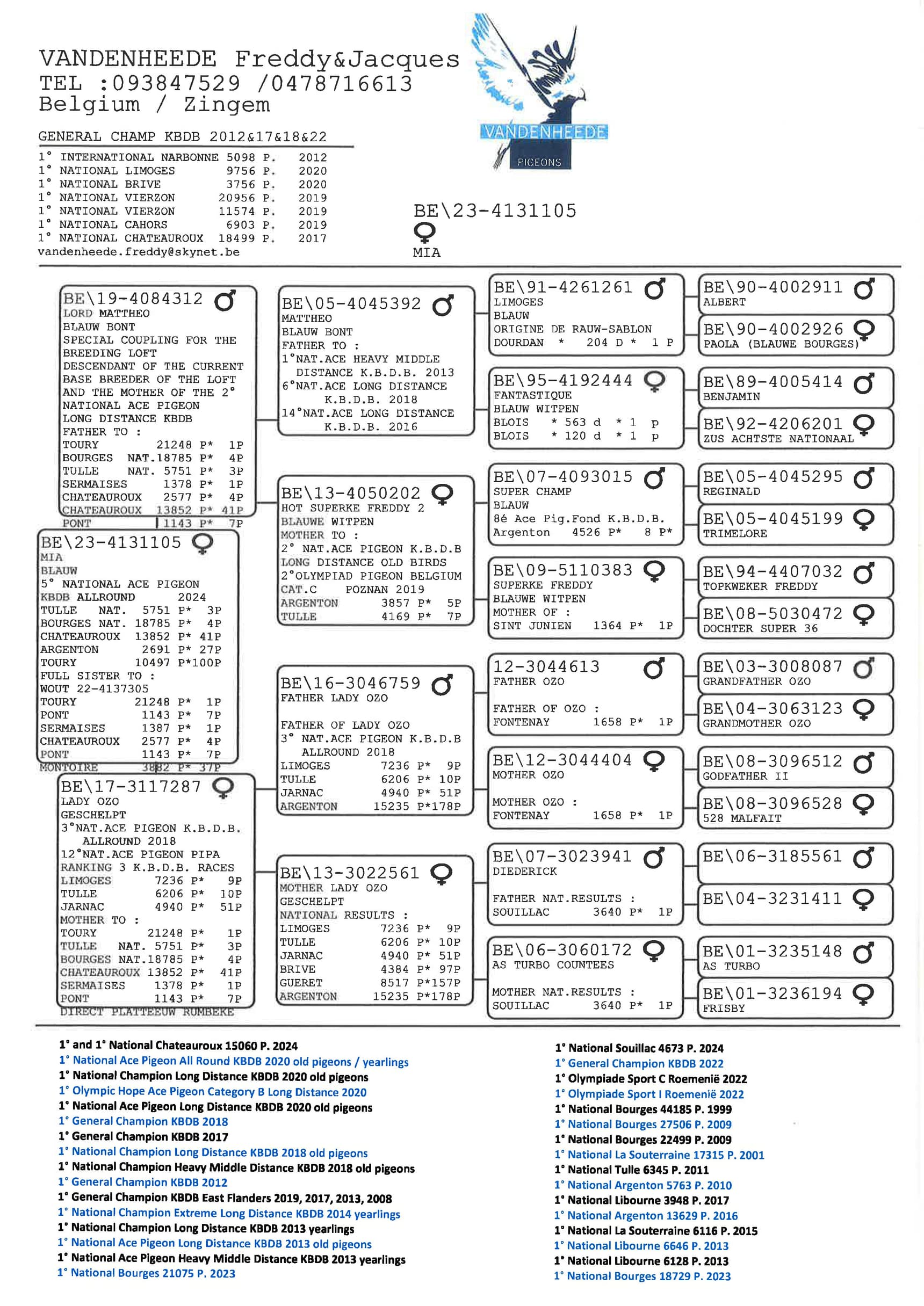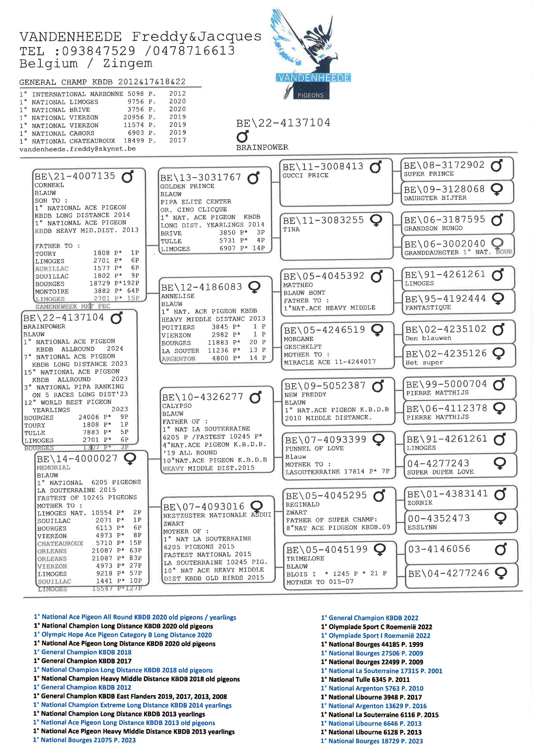 vandenheede freddy & jacques (kruisem) : 1e nationale asduif kbdb fond oude ‘24 en 1e nationale asduif kbdb allround oude & jaarse ‘24