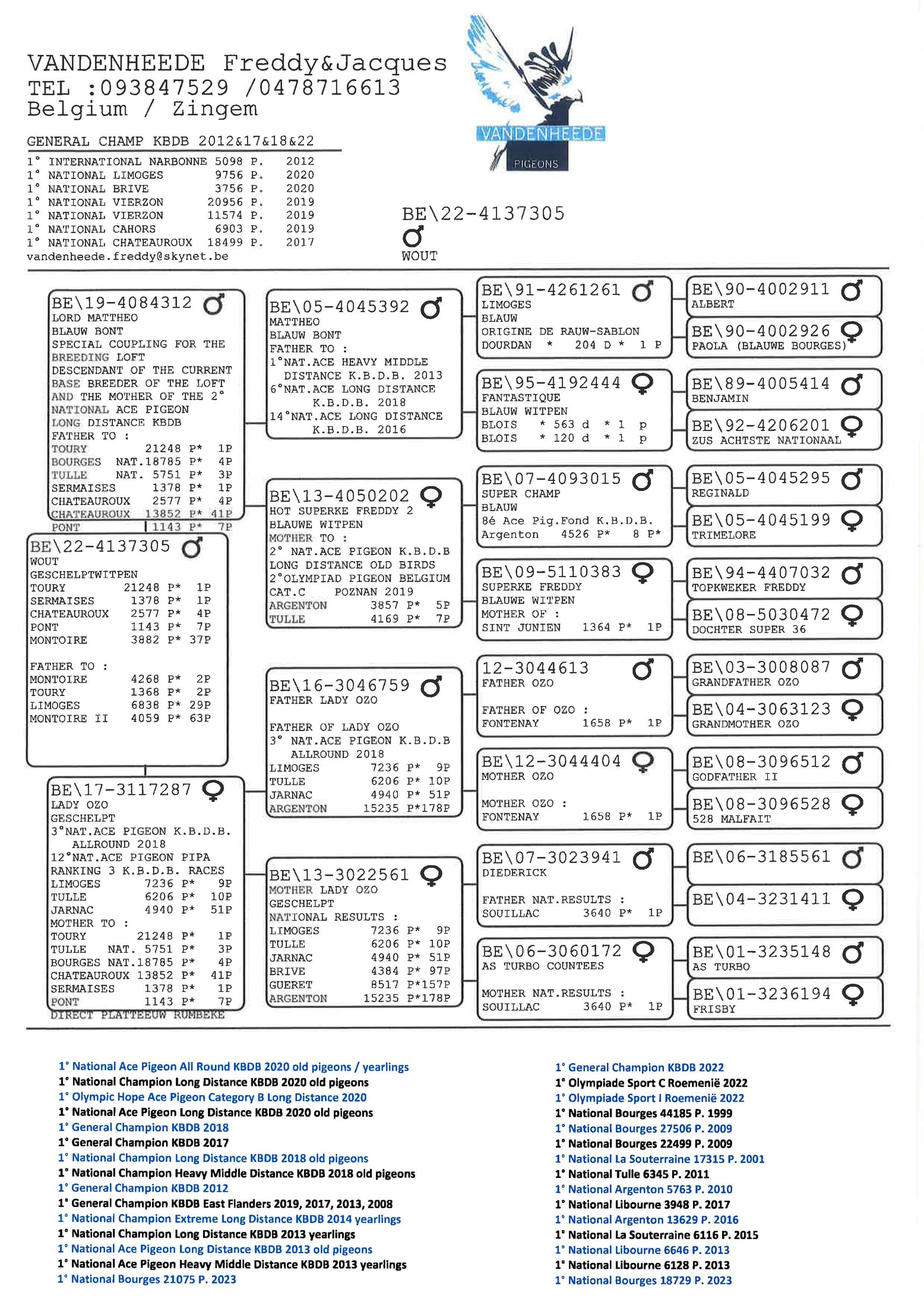 Wout 22-4137305 vloog 1° prijs van 21.248 duiven