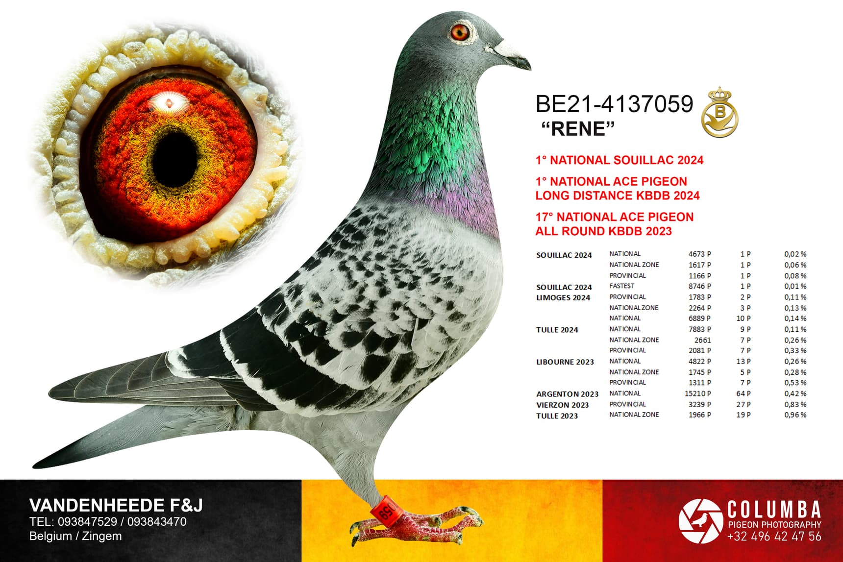 Na verschillende tweede prijzen ( totaal 5 maal 2de nationaal in 2024 ) op nationale wedstrijden , vliegt René ( 22-4137059 ) de eerste nationaal op Souillac tegen 4.673 duiven. Hij was tevens de snelste van 8.746 duiven.