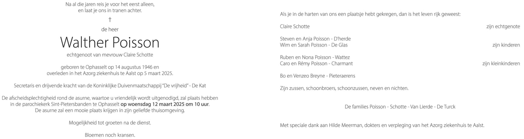 Met spijt in ons hart hebben we het overlijden van Poisson Walther vernomen. Walther was jarenlang de drijvende kracht achter duivenmaatschappij De Vrijheid - De Kat Ophasselt. Hij ontving ook een KBDB lifetime achievement voor zijn jarenlange inzet voor de duivensport.