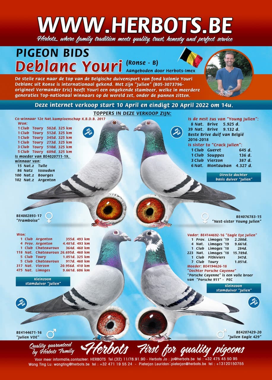 OP DIT MOMENT IS ER EEN UNIEKE AANBIEDING VAN ORIGINELE YOURI DEBLANC DUIVEN OP INTERNET VERKOOP PIGEON BIDS