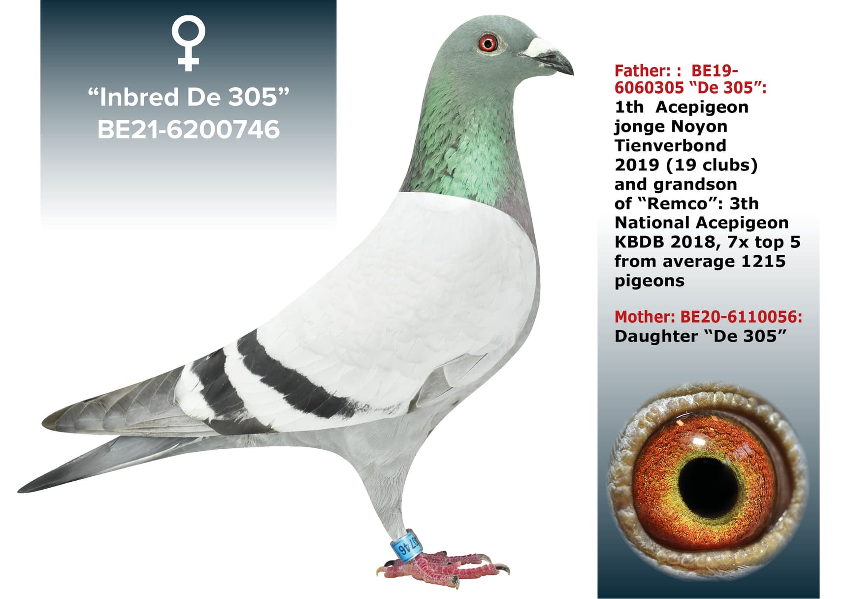 Father: : BE19-6060305 “De 305”:1th Acepigeon jonge Noyon Tienverbond 2019 (19 clubs) and grandson of “Remco”: 3th National Acepigeon KBDB 2018, 7x top 5 from average 1215 pigeons
