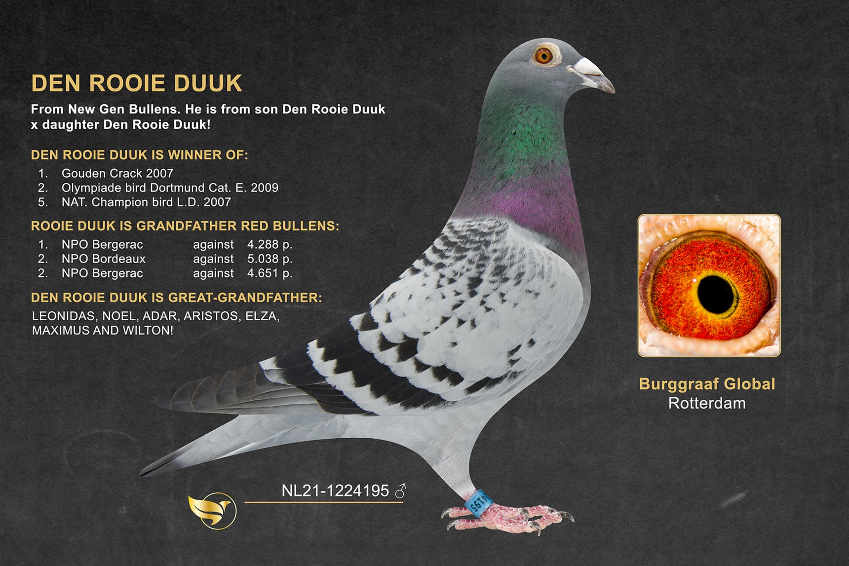 Inbred to Den Rooie Duuk. He was just like his grandson Red Bullens a phenomenal racer on the marathon! Also he grew into an absolute legendary breeder in the pigeon sport. Grandchildren, great-grandchildren and great-great-grandchildren fly at the national top.