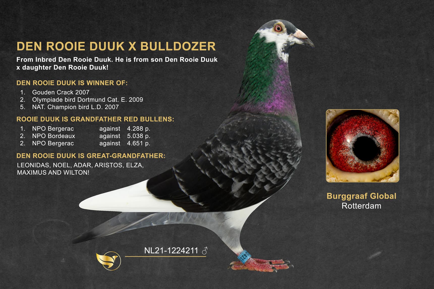 Specially from the breeding loft of Burggraaf Global. This pigeon has not been raced!