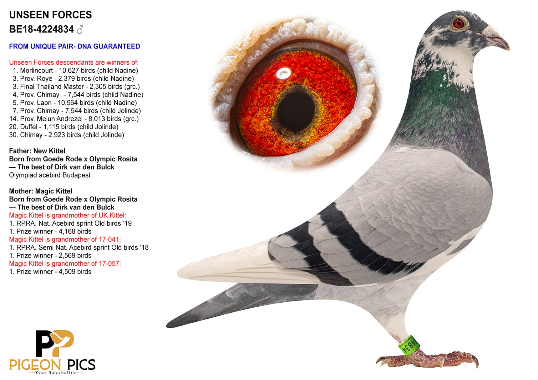 Unseen Forces is the new impressive producer of the Burggraaf Global breedingloft. He is a very strong inbred product to Goede Rode x Olympic Rosita. They are parents of: Kittel, New Kittel, Greipel, Magic Kittel and so on. Unseen is original Flanders Collection, Liedekerke.
