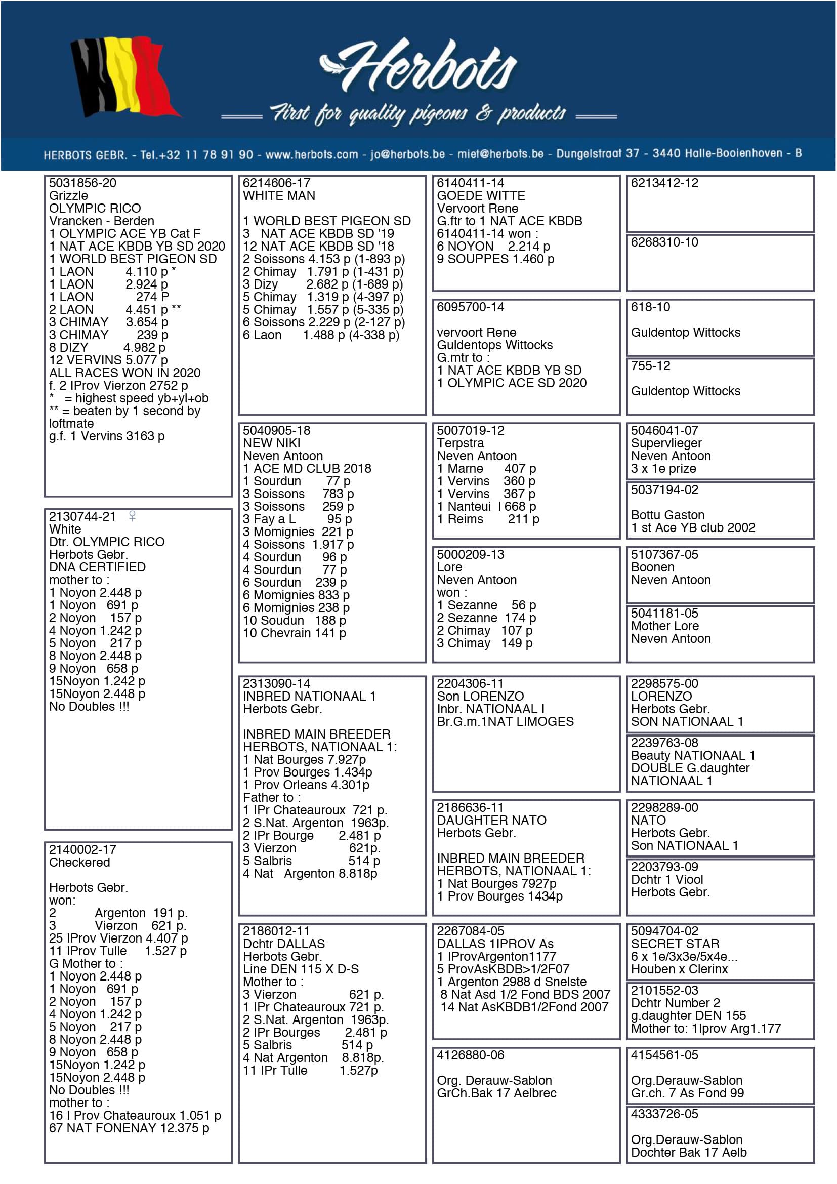 Prestaties jonge duiven uit 744/21 (meeuw Herbots)