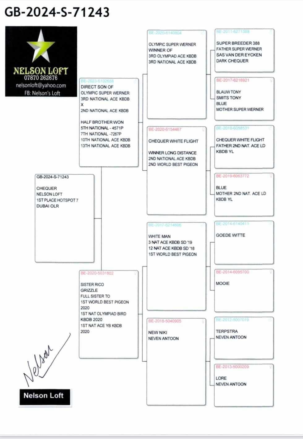 Felicitaties aan de heer Nelson Kenny uit Groot-Brittannië, hij is een goede vriend van de familie Herbots en heeft een aantal duiven van ons gekocht. Eén ervan is een volle zus van OLYMPIC RICO, zij is nu de moeder van GB 24-571243 die op 4 februari 2025 de 1e prijs won op 200 km Hotspot 7 tegen 1.241 duiven in de DUBAI One Loft Pigeon Race FCI! Echt trots op de Herbots duiven, ze doen het fantastisch goed in OLR !! Uiteraard willen wij ook Bart&Nance Van Oeckel feliciteren, zij kweekten de vader van deze winnaar!