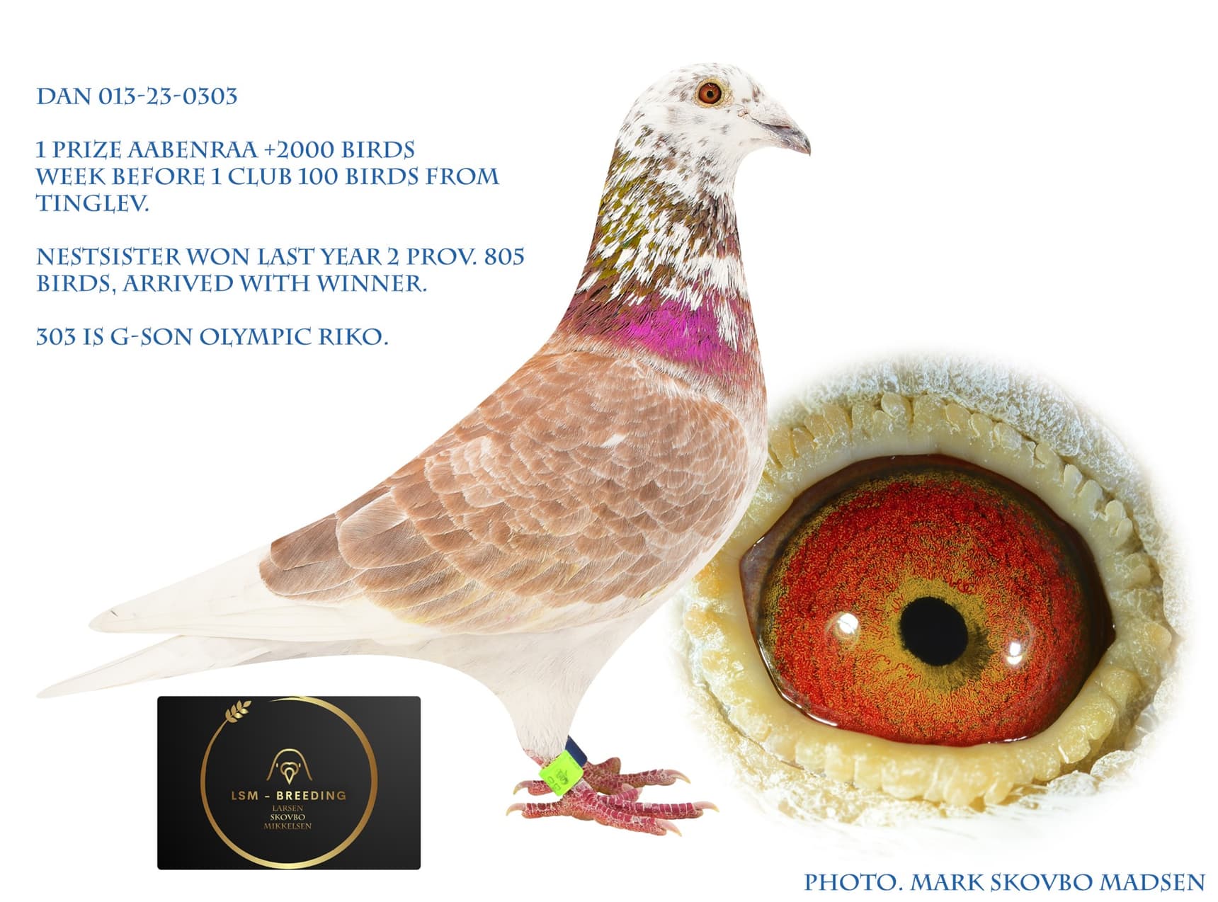 Alweer ontvingen we een topreferentie uit de lijn van onze superkweker “Olympic Rico”. Een kleinzoon van hem wint afgelopen zaterdag in Denemarken bij Mark Skovbo Madsen een 1ste prijs tegen meer dan 2.000 duiven. Deze duif won de week voordien ook al de 1ste in de club op een andere vlucht.