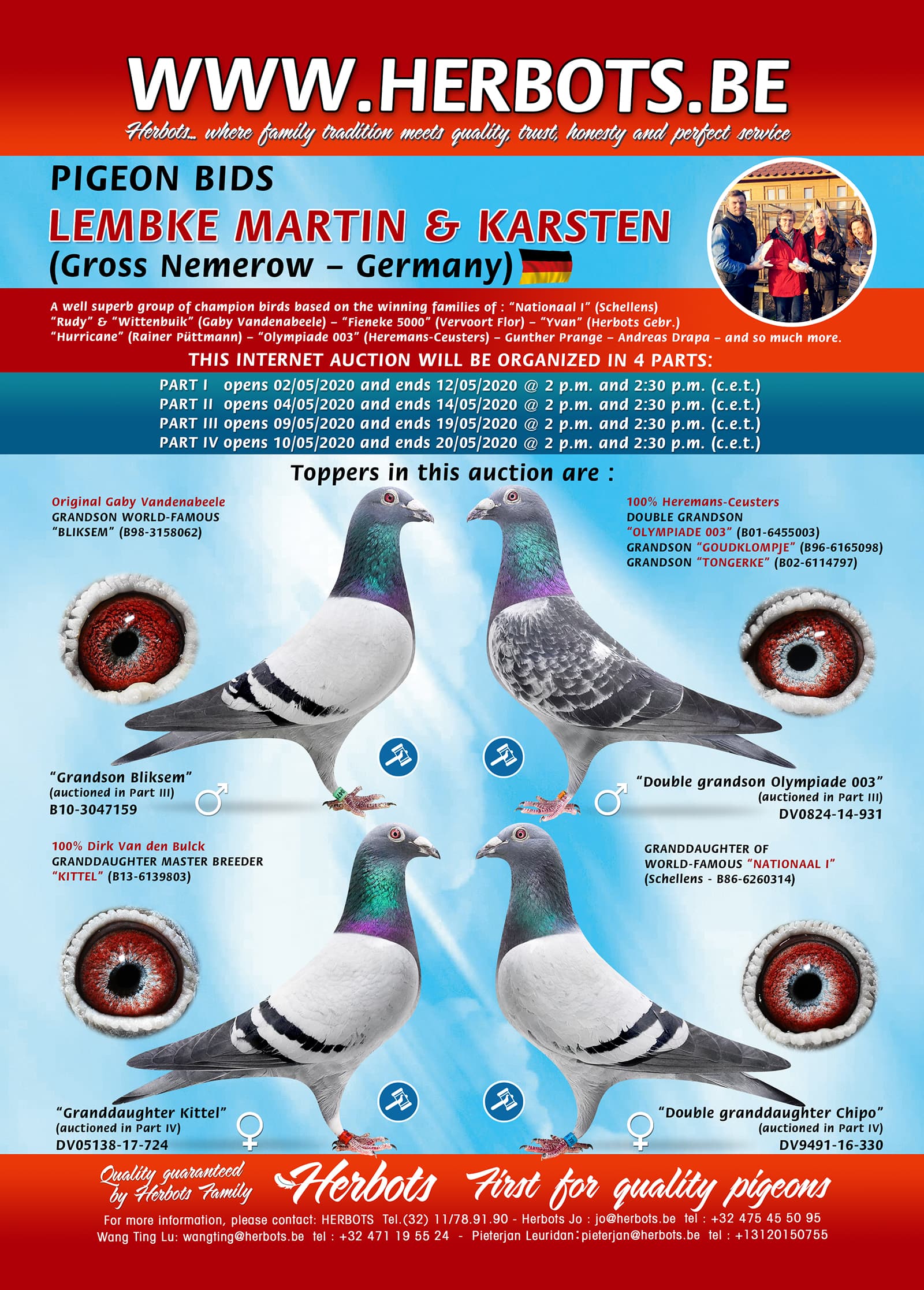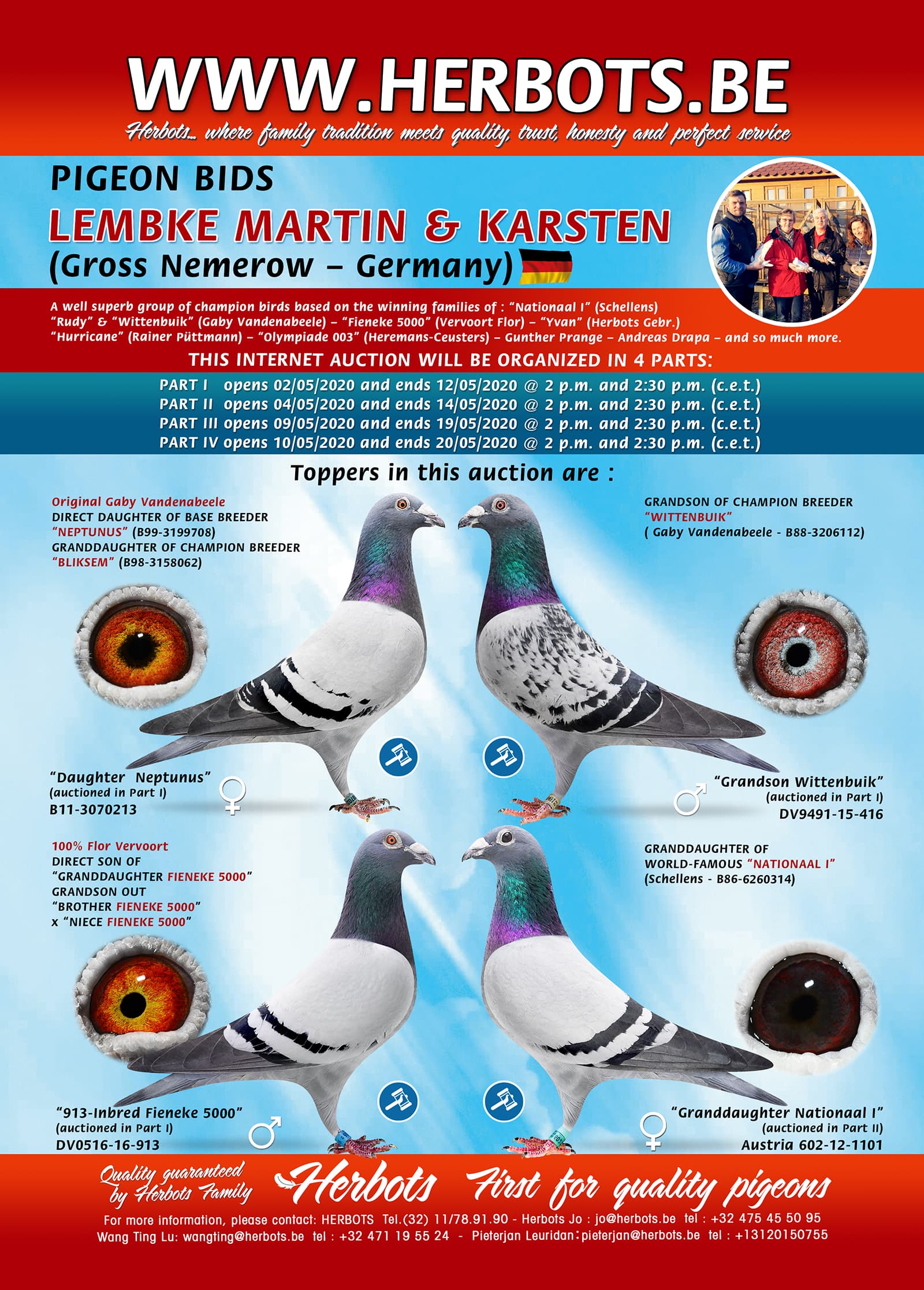 Wij als familie Herbots willen onze kopers steunen tijdens deze moeilijke Corona tijden en daarom hebben we besloten om vanaf 22/04 tot en met 20/05/2020 alle transportkosten van uw aangekochte duiven voor onze rekening te nemen. Met andere woorden uw aankoop wordt GRATIS bij u thuis bezorgd!