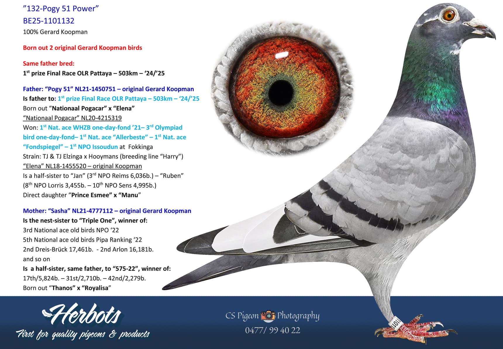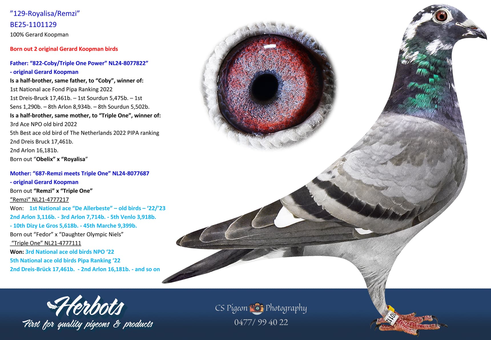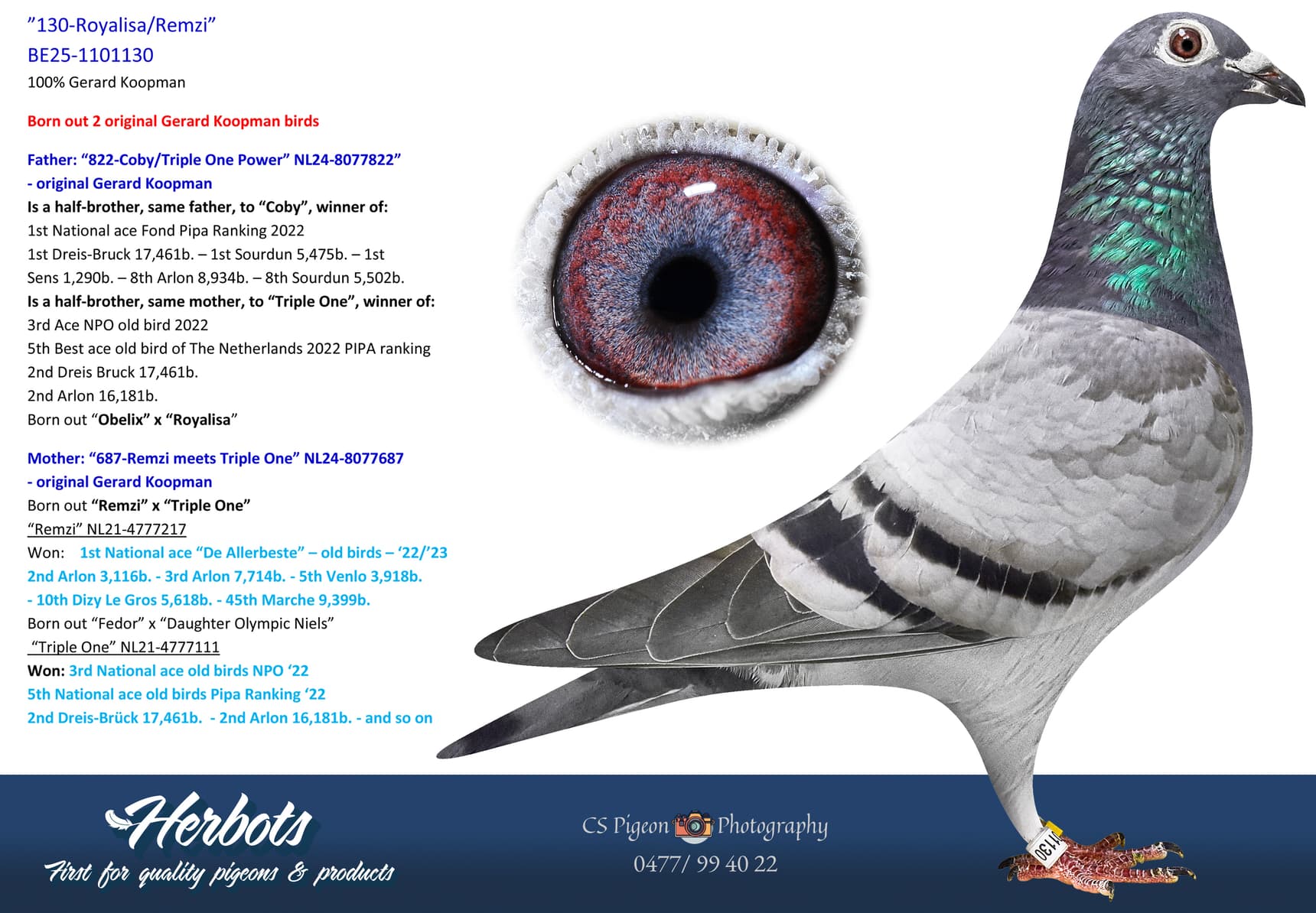 Born out “Thanos” (son out 1st Nat. ace KBDB “De Bonte Crack” x “Perfect Sero Sero”) x “Royalisa”(half-sister to famous Koopman birds “Fahsai”, “Calisto”, “Boaz”, “Junora” and so on)