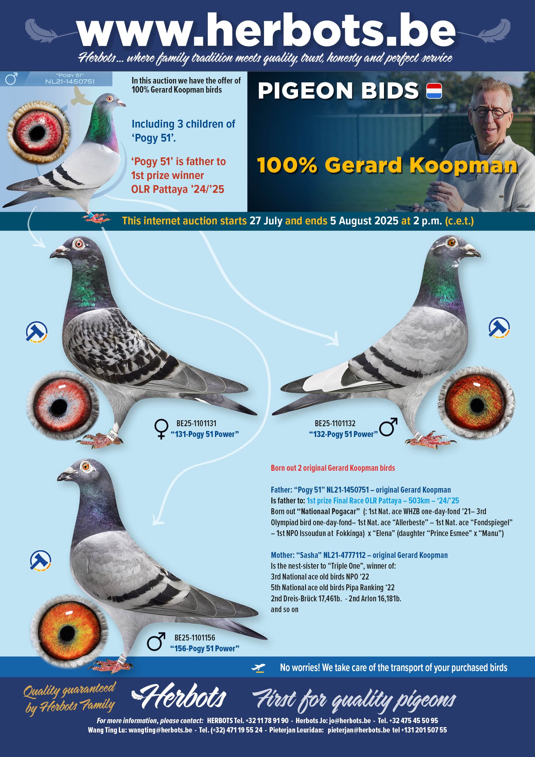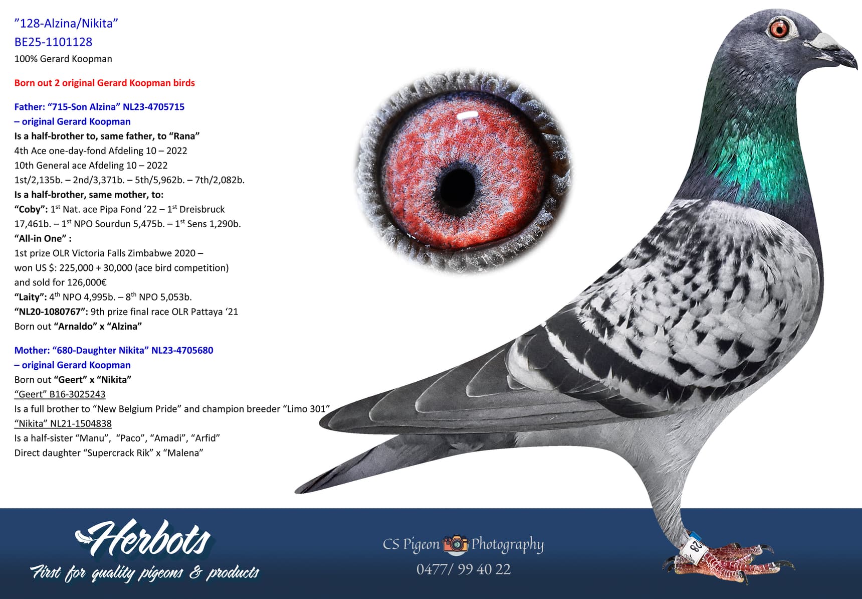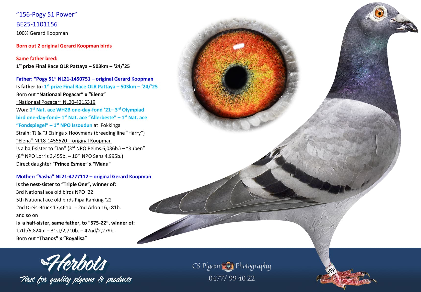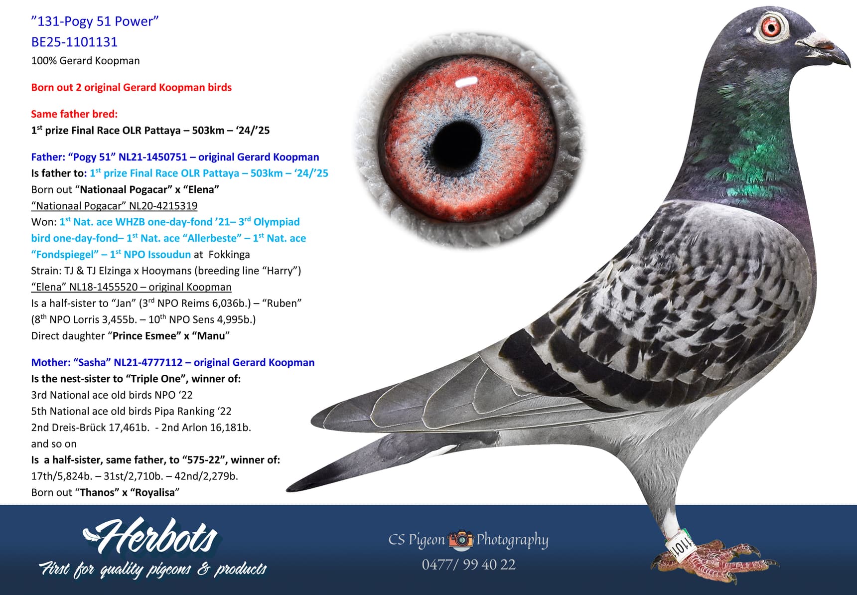 Born out “Thanos” (son out 1st Nat. ace KBDB “De Bonte Crack” x “Perfect Sero Sero”) x “Royalisa”(half-sister to famous Koopman birds “Fahsai”, “Calisto”, “Boaz”, “Junora” and so on)