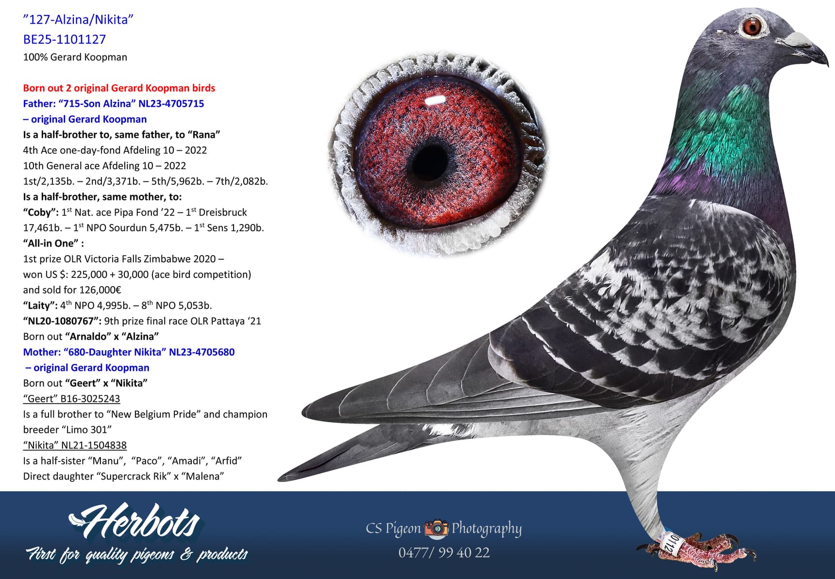 Born out “Bruce” (1st Nat. St Vincent 3,045b. – 896km) x “Daughter As-Trix” (Is a full sister to “Hamilton”: 3rd Nat. Chateauroux 18,725b. and “Alonso”: 4th Nat. Chateauroux 17,109b.)