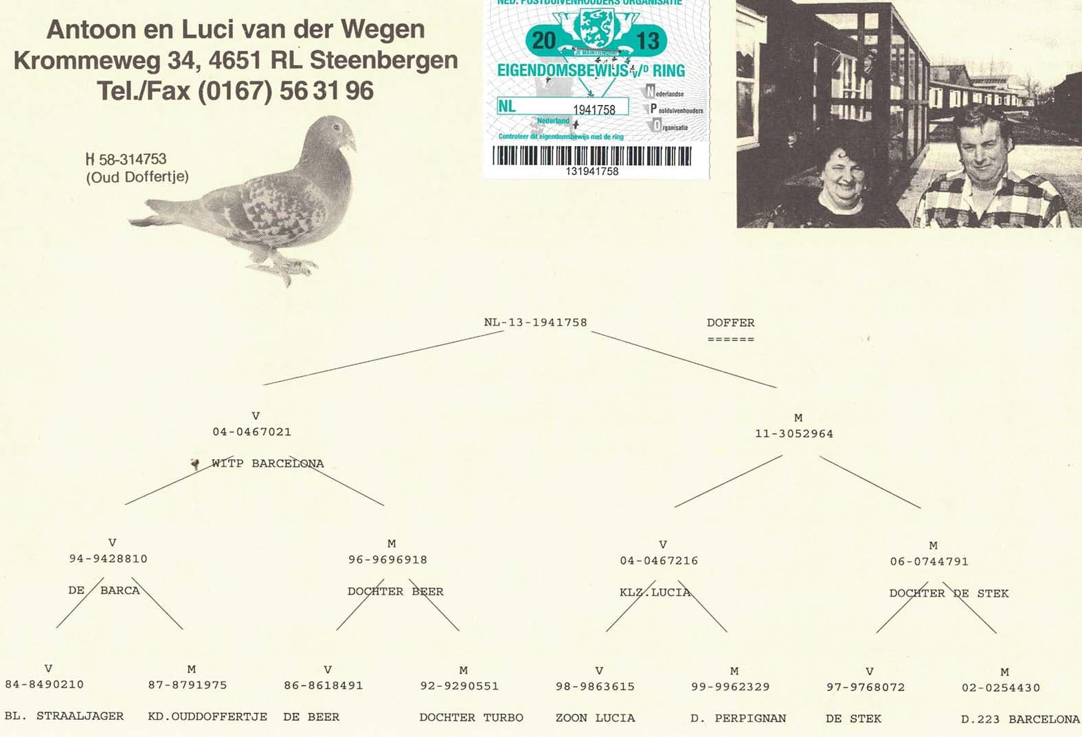Grandson “De Europeaan”, winner of 32nd Nat. Barcelona 8,042b. - 79th Internat. Barcelona 27,669b. – 49th Nat. Perpignan 6,507b. – 54th Nat.Barcelona 7,016b.