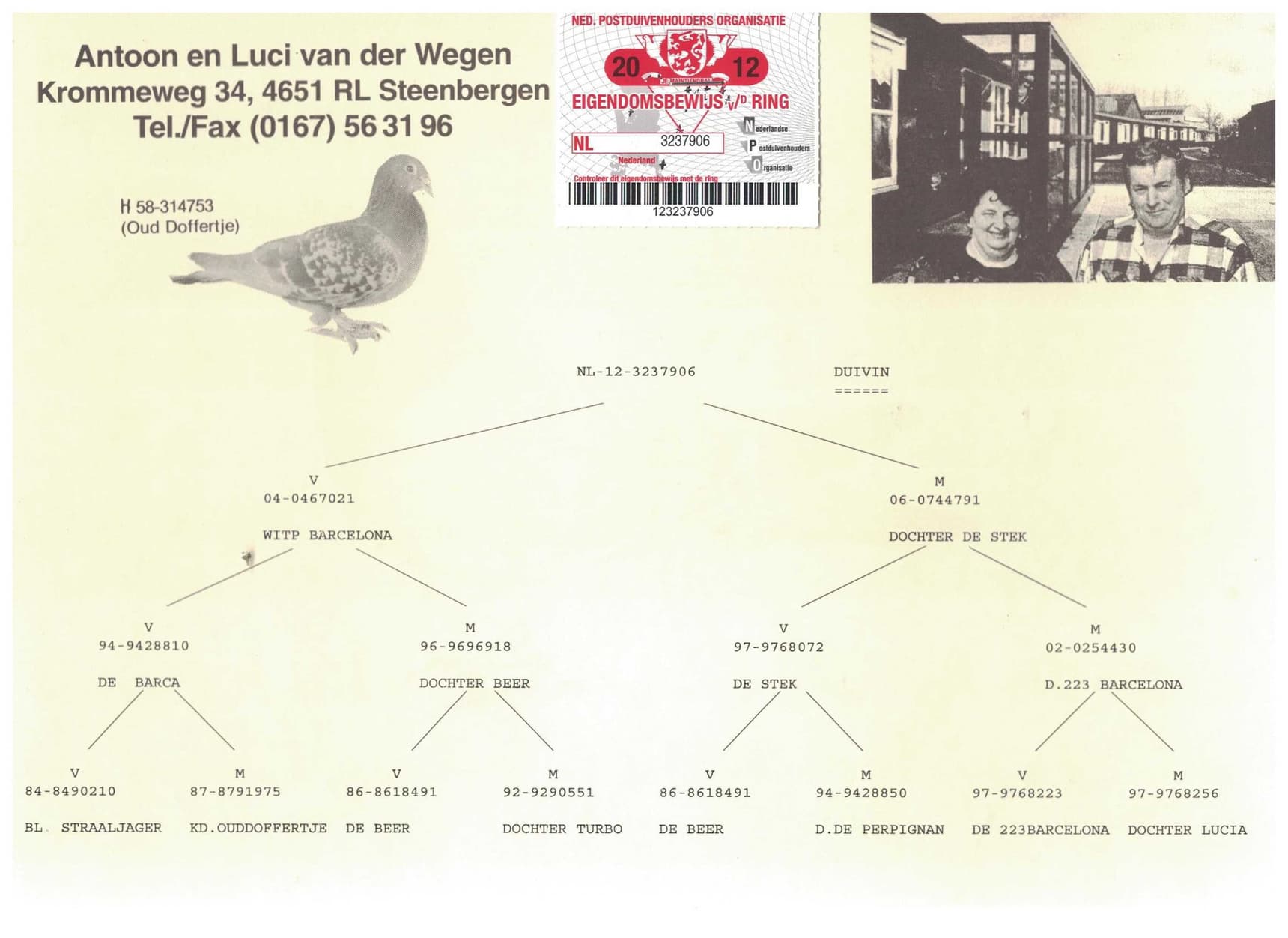Granddaughter “Witpen Barcelona”, winner of 10th Nat. Barcelona 7,073b. – 28th Internat. Barcelona 23,708b. – 36th Nat. Narbonne 2,563b.