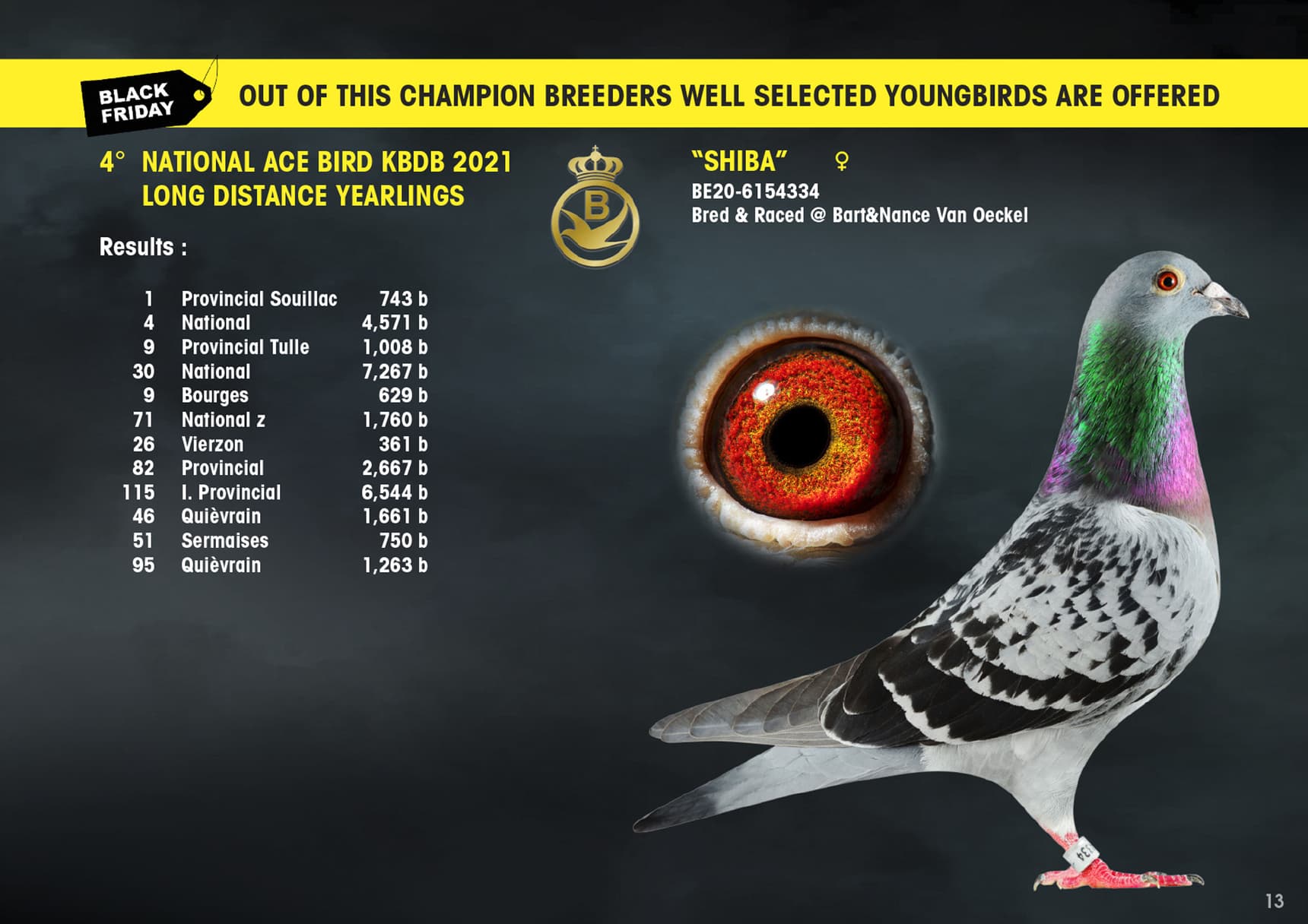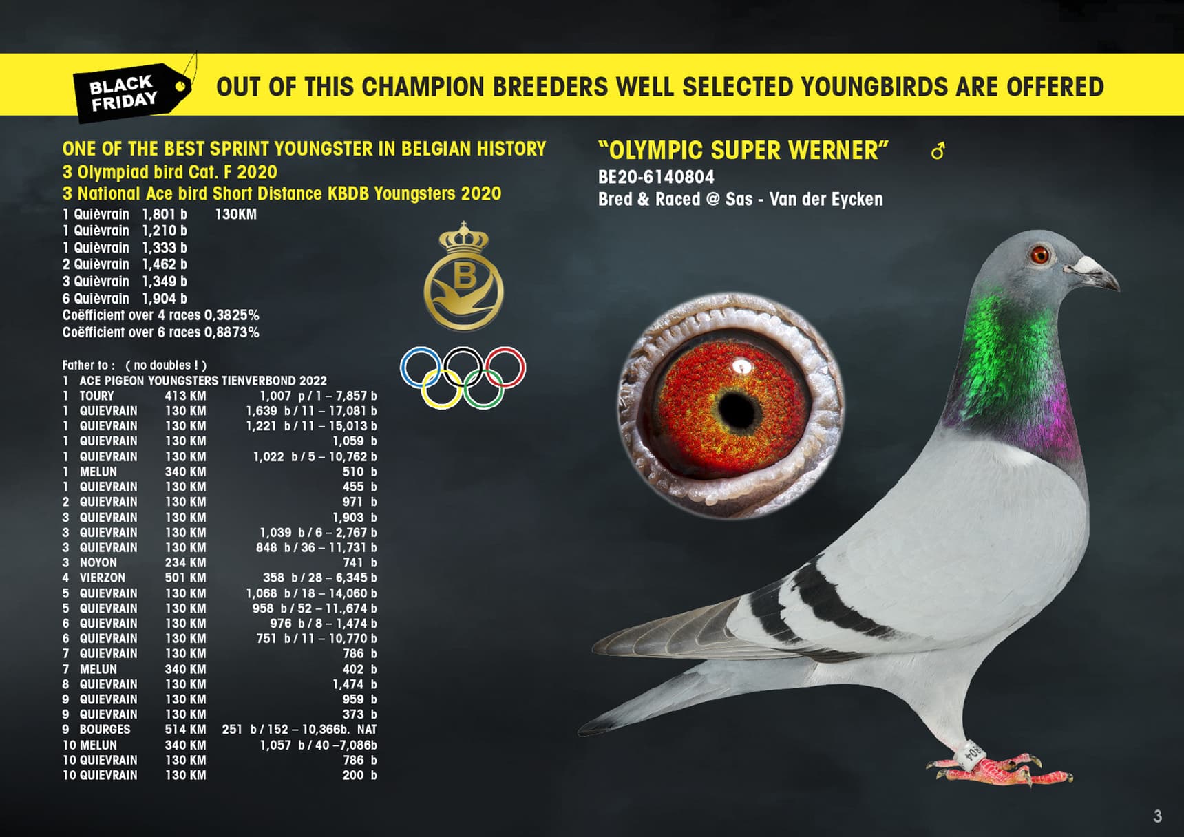 3rd Olympiad bird - 3rd Nat. ace KBDB short distance youngbirds - 1st Quievrain 1,210b. - 1st Quievrain 1,801b. - 1st Quievrain 1,133b.