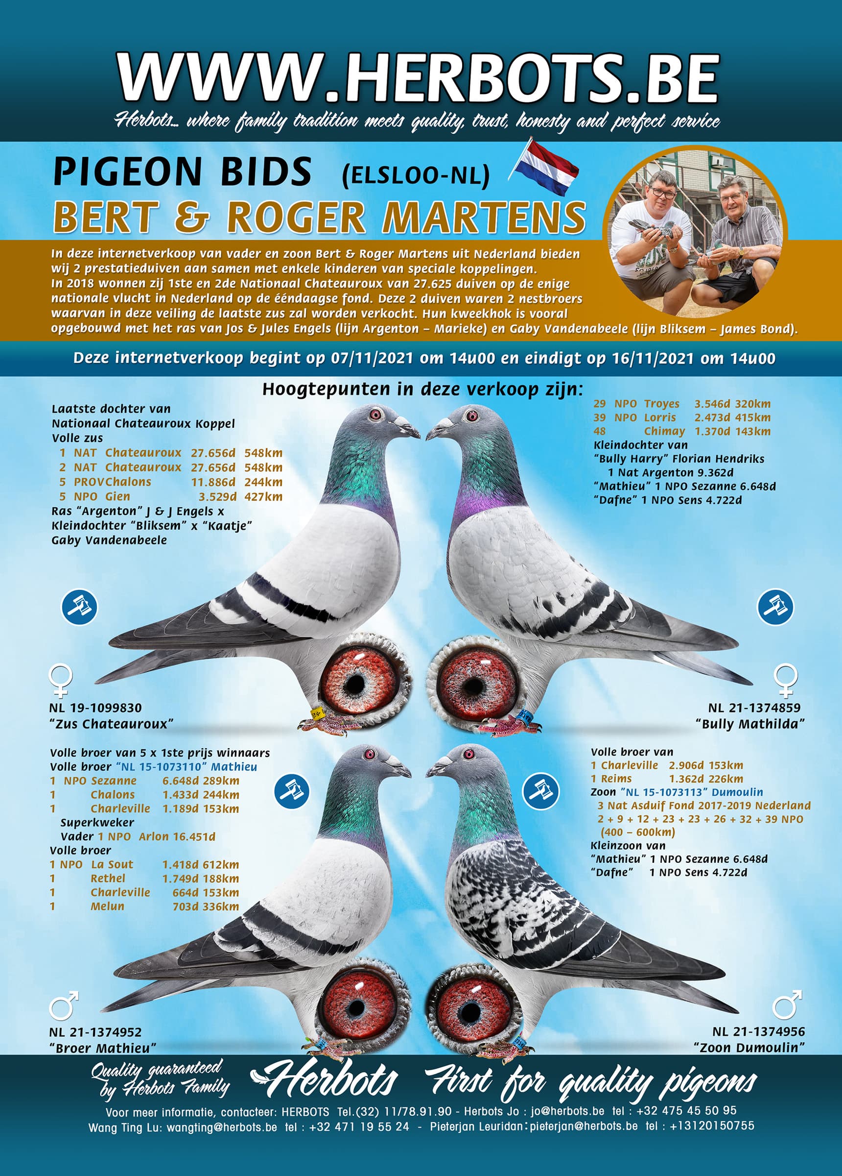 In deze internetverkoop van vader en zoon Bert & Roger Martens uit Nederland bieden wij 2 prestatieduiven aan samen met enkele kinderen van speciale koppelingen. In 2018 wonnen zij 1ste en 2de Nationaal Chateauroux van 27.625 duiven op de enige nationale vlucht in Nederland op de ééndaagse fond. Deze 2 duiven waren 2 nestbroers waarvan in deze veiling de laatste zus zal worden verkocht. Hun kweekhok is vooral opgebouwd met het ras van Jos & Jules Engels ( lijn Argenton – Marieke ) en Gaby Vandenabeele ( lijn Bliksem – James Bond ).