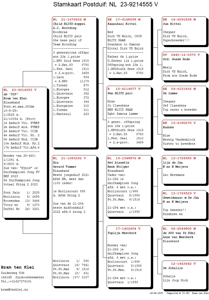 Komt uit “Den 444” (2e en 5e Nat. Asduif) x “Blauw Kampioentje” (1e Quievrain 2.960 d. 1e Noyon 3.262 d. bij Jan Diels)