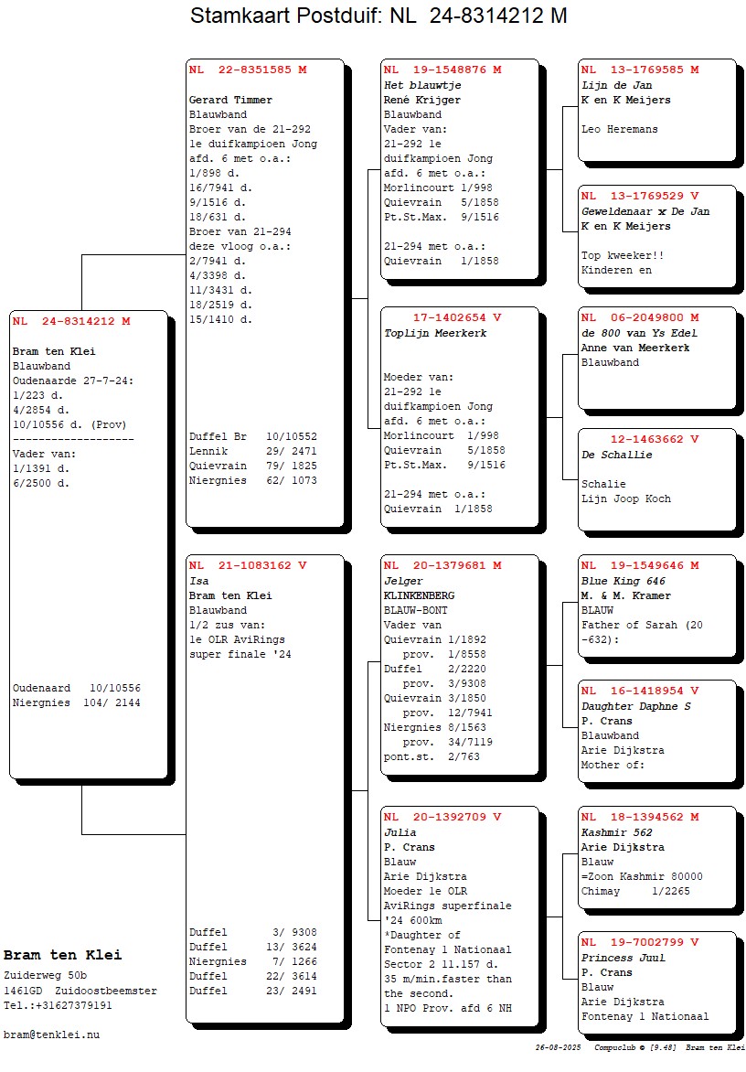 Komt uit “Den 444” (2e en 5e Nat. Asduif) x “Blauw Kampioentje” (1e Quievrain 2.960 d. 1e Noyon 3.262 d. bij Jan Diels)