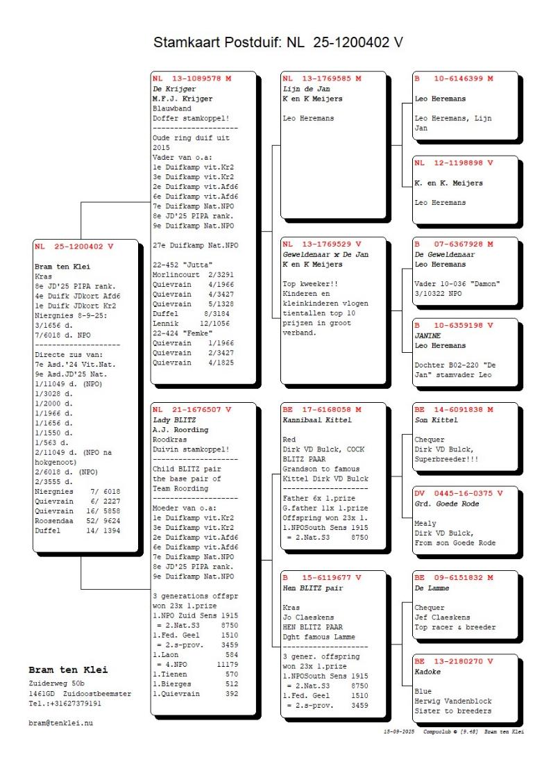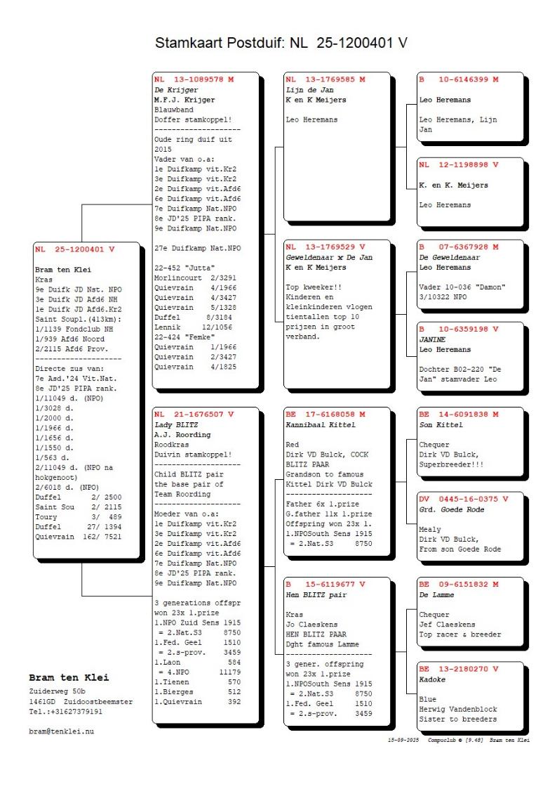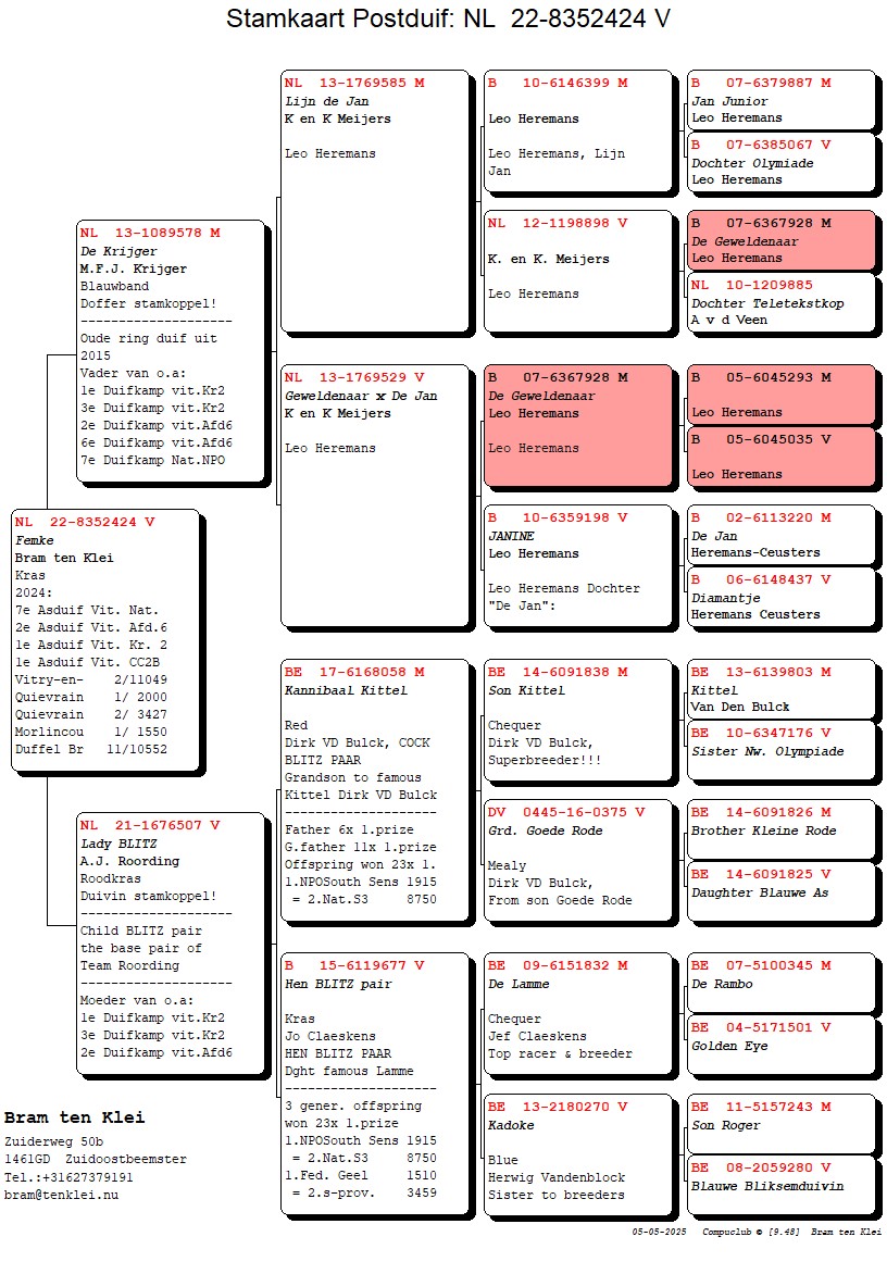 De moeder van “De Krijger” is de nestzus van NL 13-1769528 die op haar beurt bij Peter van de Merwe moeder is van de 5de Nat. Asduif jonge duiven 2020 Pipa