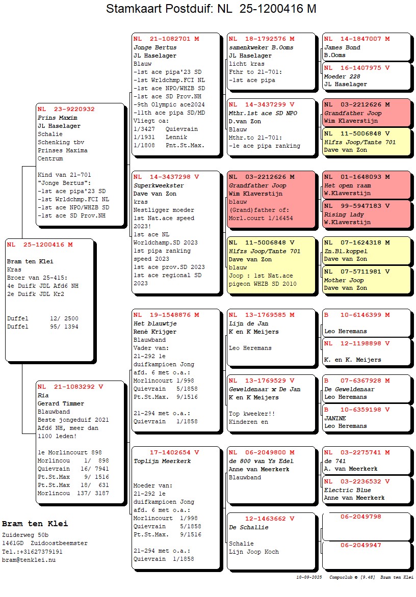 Komt uit “Den 444” (2e en 5e Nat. Asduif) x “Blauw Kampioentje” (1e Quievrain 2.960 d. 1e Noyon 3.262 d. bij Jan Diels)
