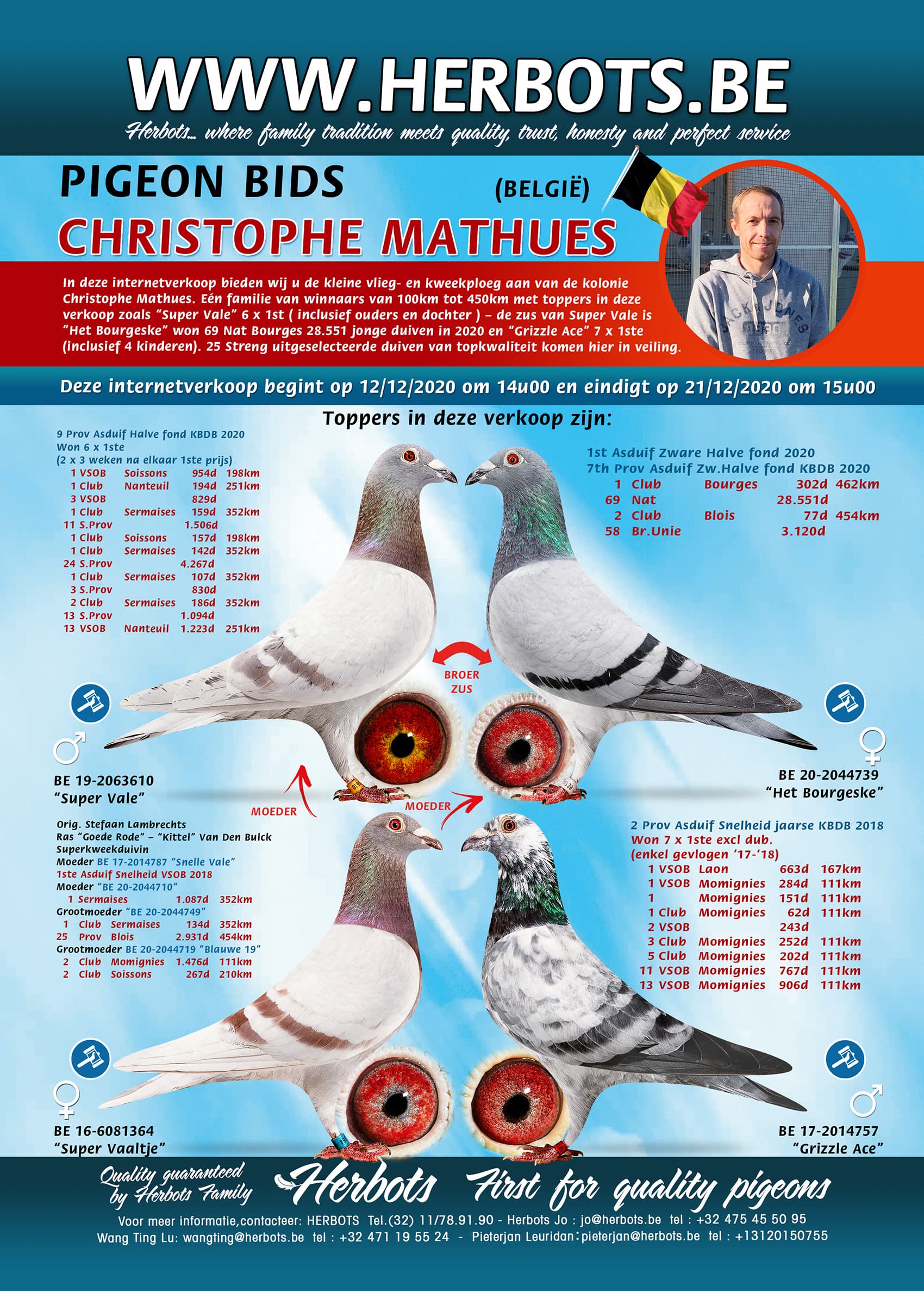 In deze internetverkoop bieden wij u de kleine vlieg- en kweekploeg aan van de kolonie Christophe Mathues. Eén familie van winnaars van 100km tot 450km met toppers in deze verkoop zoals “Super Vale” 6 x 1st ( inclusief ouders en dochter ) – de zus van Super Vale is “Het Bourgeske” won 69 Nat Bourges 28.551 jonge duiven in 2020 en “Grizzle Ace” 7 x 1ste ( inclusief 4 kinderen ). 25 Streng uitgeselecteerde duiven van topkwaliteit komen hier in veiling.
