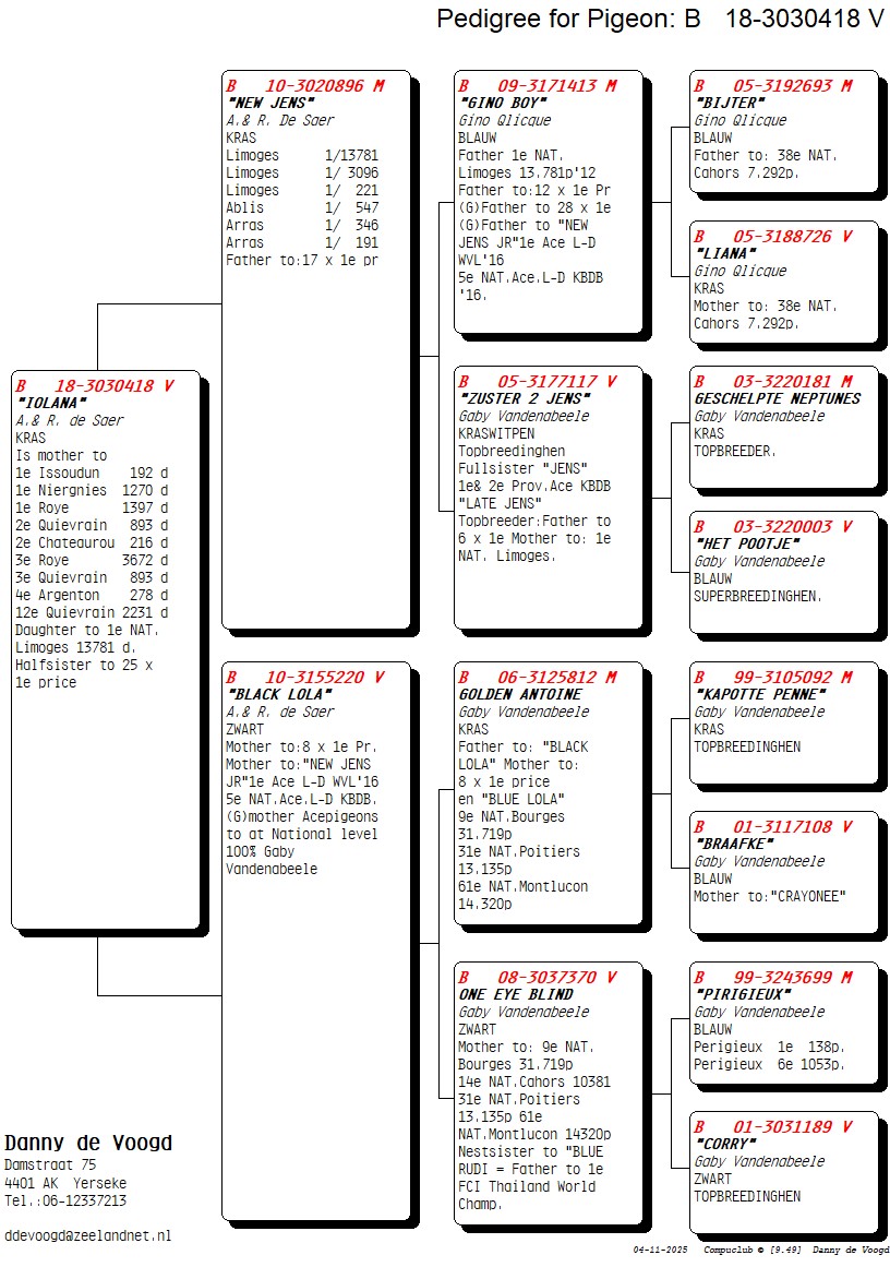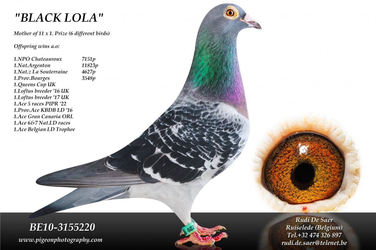 Full sister to “Blue Lola” Gaby Vandenabeele: 9th Nat. Bourges 31.719p. – 31st Nat. Poitiers 13.135p. – 61st Nat. Montlucon 14.320p.