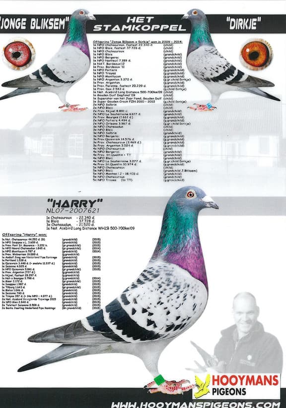 “Olympic Schanulleke” 1st Nat. Acepigeon GMD – 3rd World Best Pigeon Cat. C Poznan – 3 Orleans 6.951p. – 8 Orleans 10.375p. – 8 Tours 9.061p. –