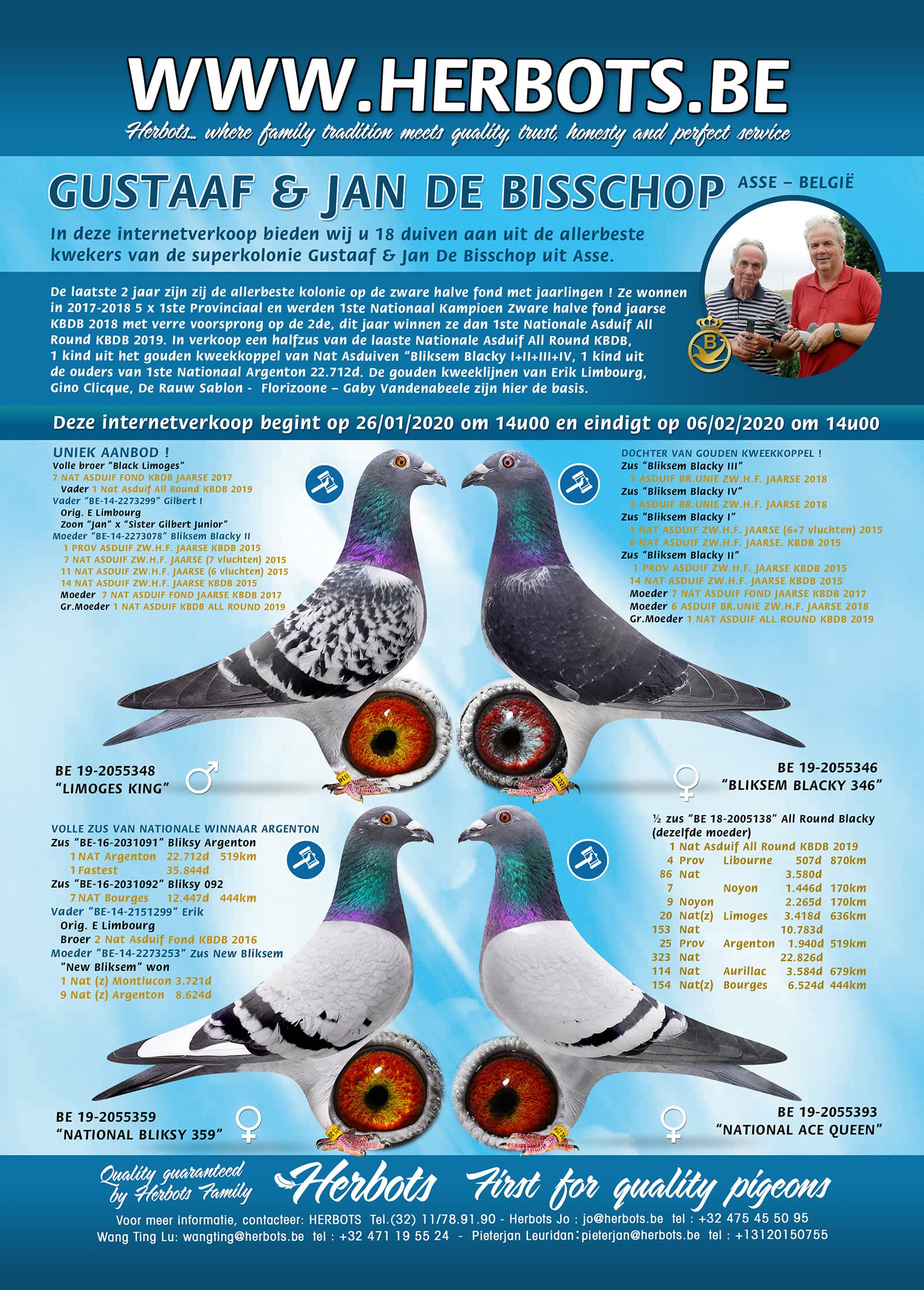In deze internetverkoop bieden wij u 18 duiven aan uit de allerbeste kwekers van de superkolonie Gustaaf & Jan De Bisschop uit Asse. De laatste 2 jaar zijn zij de allerbeste kolonie op de zware halve fond met jaarlingen ! Ze wonnen in 2017-2018 5 x 1ste Provinciaal en werden 1ste Nationaal Kampioen Zware halve fond jaarse KBDB 2018 met verre voorsprong op de 2de, dit jaar winnen ze dan 1ste Nationale Asduif All Round KBDB 2019. In verkoop een halfzus van de laatste Nationale Asduif All Round KBDB, 1 kind uit het gouden kweekkoppel van Nat Asduiven “Bliksem Blacky I+II+III+IV, 1 kind uit de ouders van 1ste Nationaal Argenton 22.712d. De gouden kweeklijnen van Erik Limbourg, Gino Clicque, De Rauw Sablon - Florizoone – Gaby Vandenabeele zijn hier de basis.