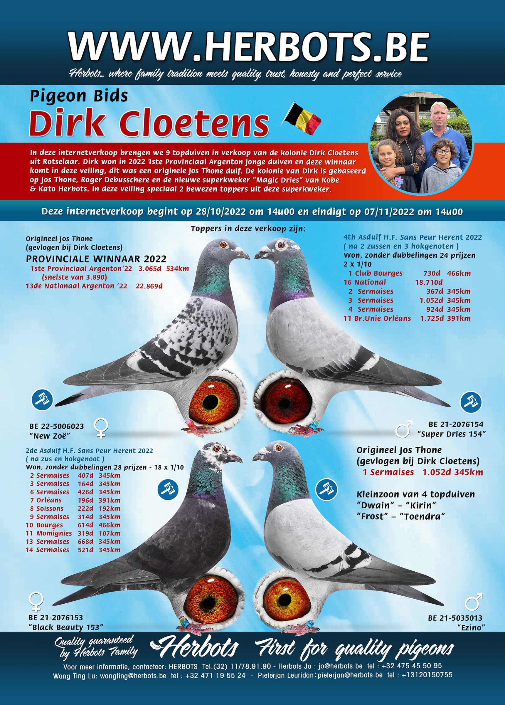 In deze internetverkoop brengen we 9 topduiven in verkoop van de kolonie Dirk Cloetens uit Rotselaar. Dirk won in 2022 1ste Provinciaal Argenton jonge duiven en deze winnaar komt in deze veiling, dit was een originele Jos Thone duif. De kolonie van Dirk is gebaseerd op Jos Thone, Roger Debusschere en de nieuwe superkweker “Magic Dries” van Kobe & Kato Herbots. In deze veiling speciaal 2 bewezen toppers uit deze superkweker.