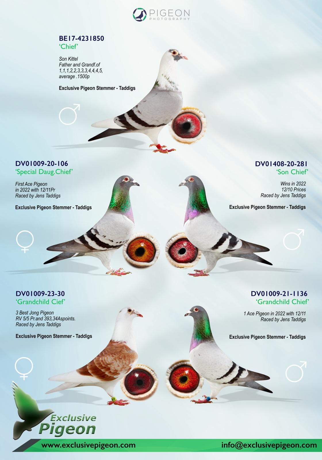 In 2019, Andreas Stemmer and Jens Taddigs joined forces and founded "Exclusive Pigeon". Together they only went for the very best and we are talking about direct children of "Olympic Rico" (Olympiad pigeon and 1st Nat. ace pigeon KBDB speed) - "Kittel" and "Greipel" (Dirk Van den Bulck) - - "White Man" (Vervoort) - "Porsche 911" - Olympic Gladiator" - "Luna" - "Prince Porsche" (PEC) etc...