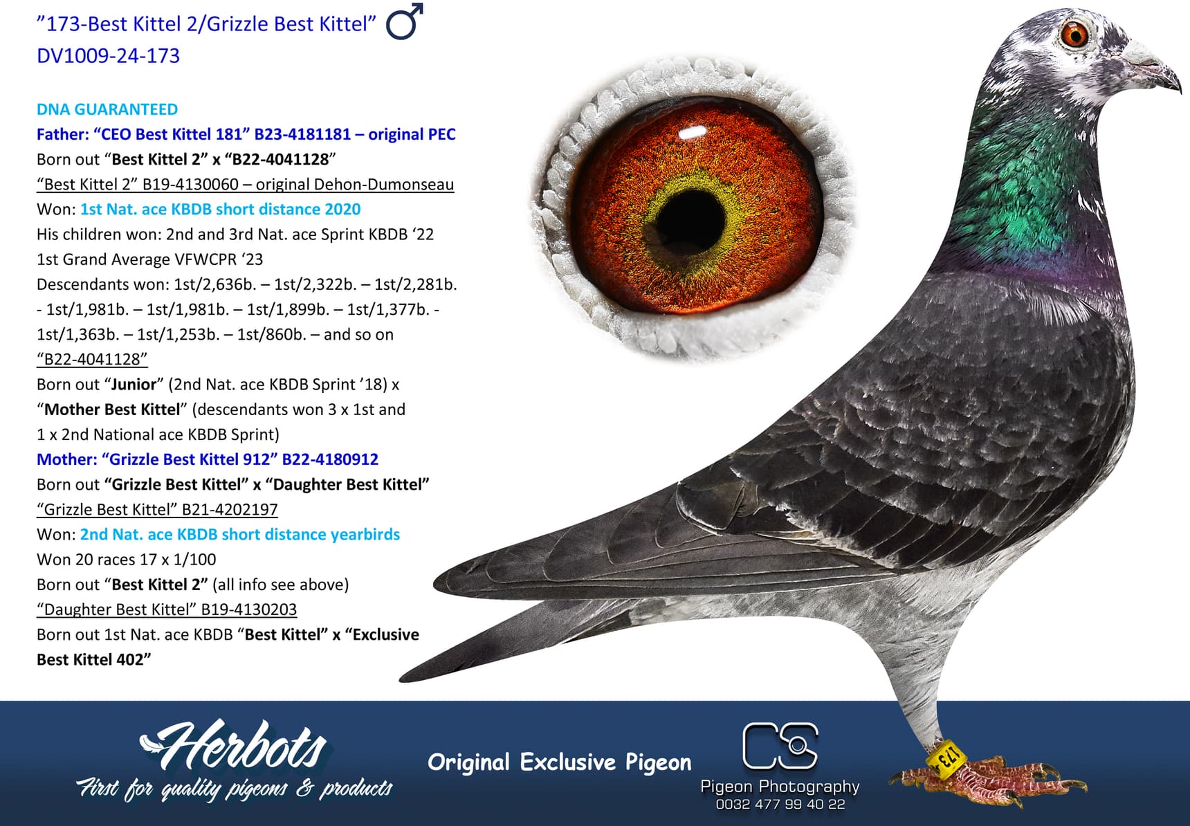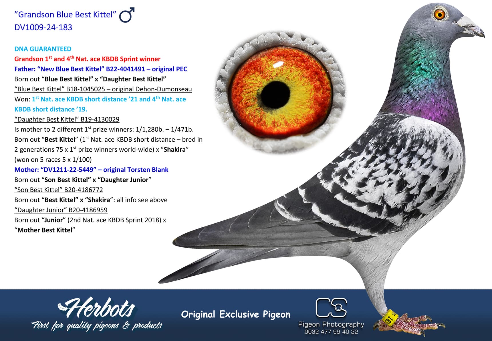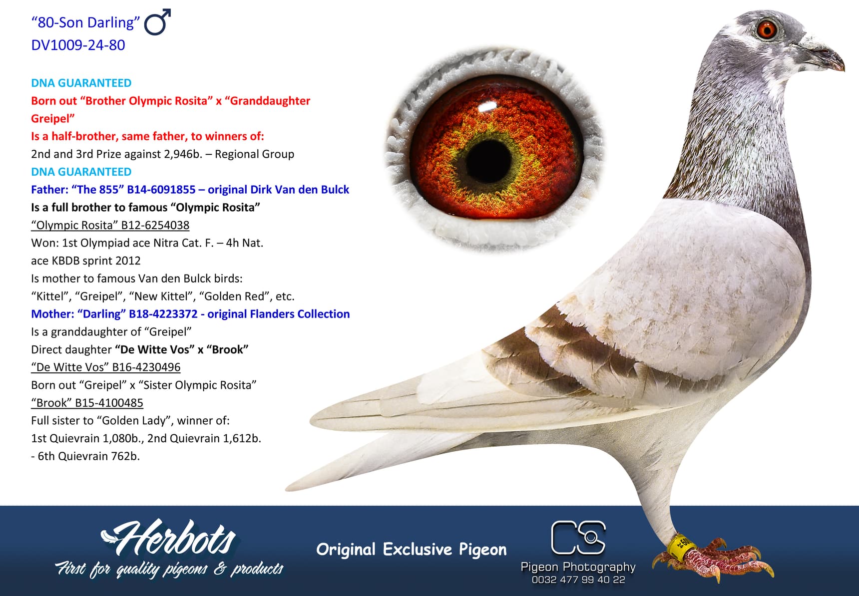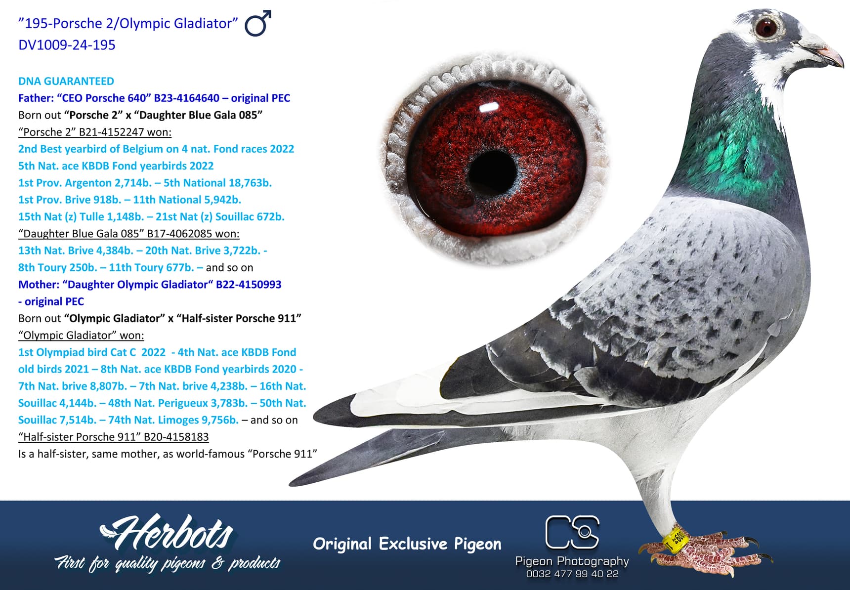 Born out “Brother Blue Lagoon” (original Geerinckx) x “Blue Gala” (won: 26th Vierzon 6,422b. – 34th Argenton 4,110b. - 80th Nat. Jarnac 4,559b. – 97th Nat. Jarnac 4,167b. – 120th Nat. Tulle 8,621b. and so on – Is a full sister to 1st Nat. Bourges “Louise”)