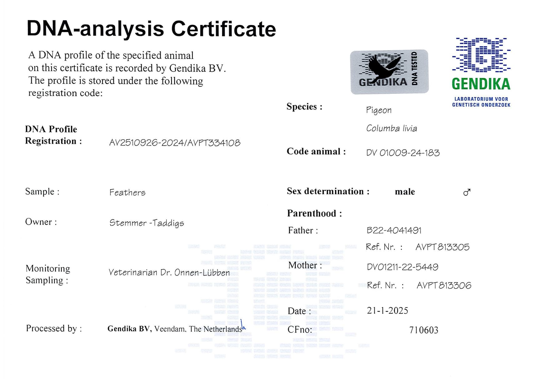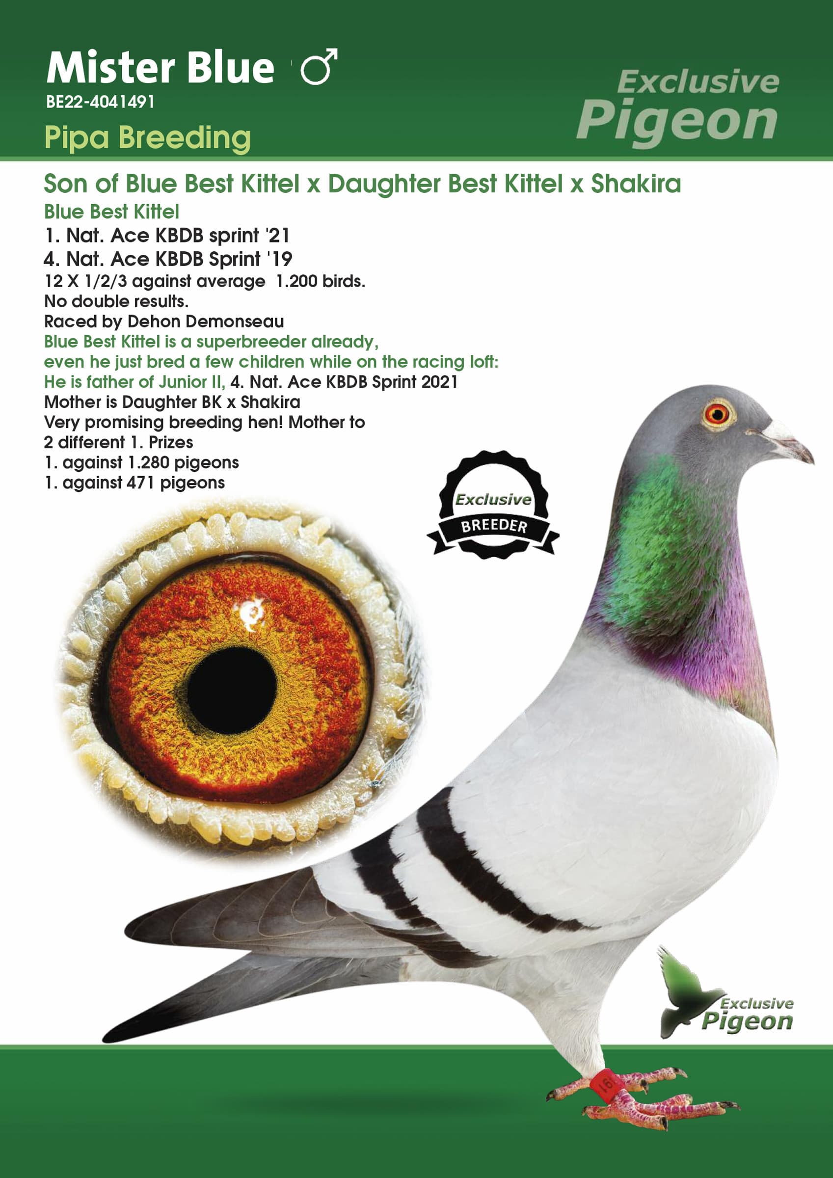 Born out “Best Kittel” (1st Nat. ace KBDB short distance – bred in 2 generations 75 x 1st prize winners world-wide) x “Shakira” (won on 5 races 5 x 1/100)