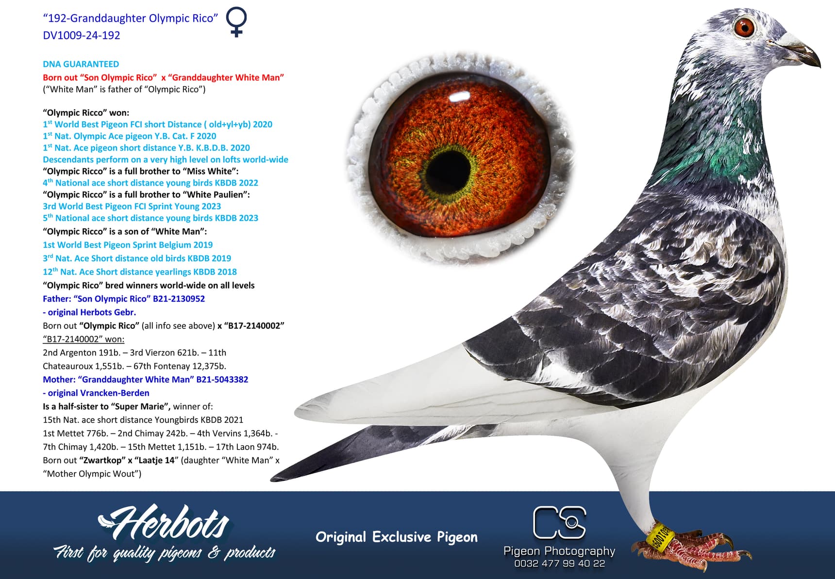 Direct son “White Man” x “Zuske 23” (full sister to “Olympic Wout” – Olympiad bird Polen Cat. F 2019)