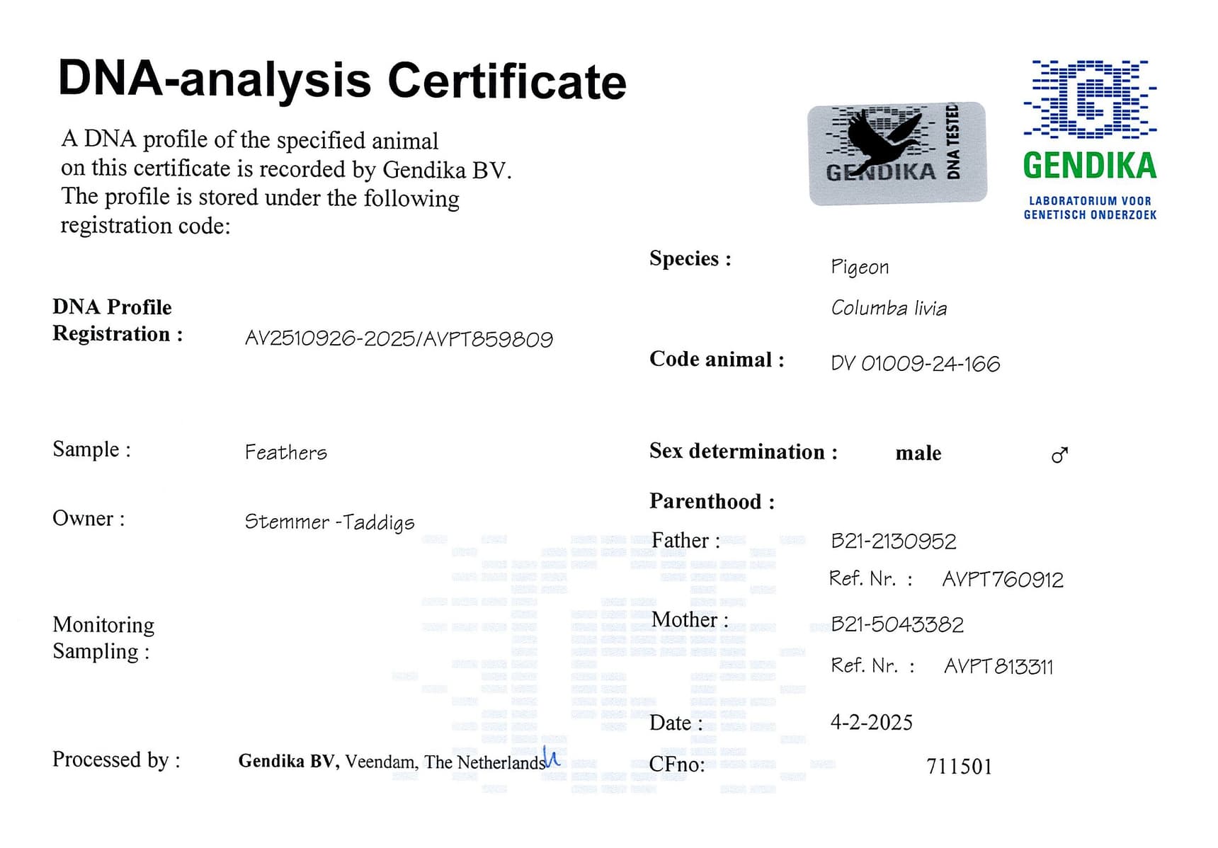 Born out “Zwartkop” x “Laatje 14” (daughter “White Man” x “Mother Olympic Wout”)