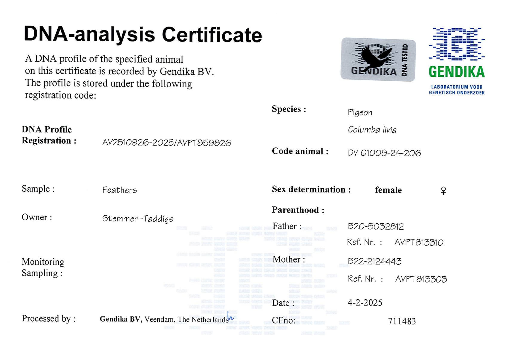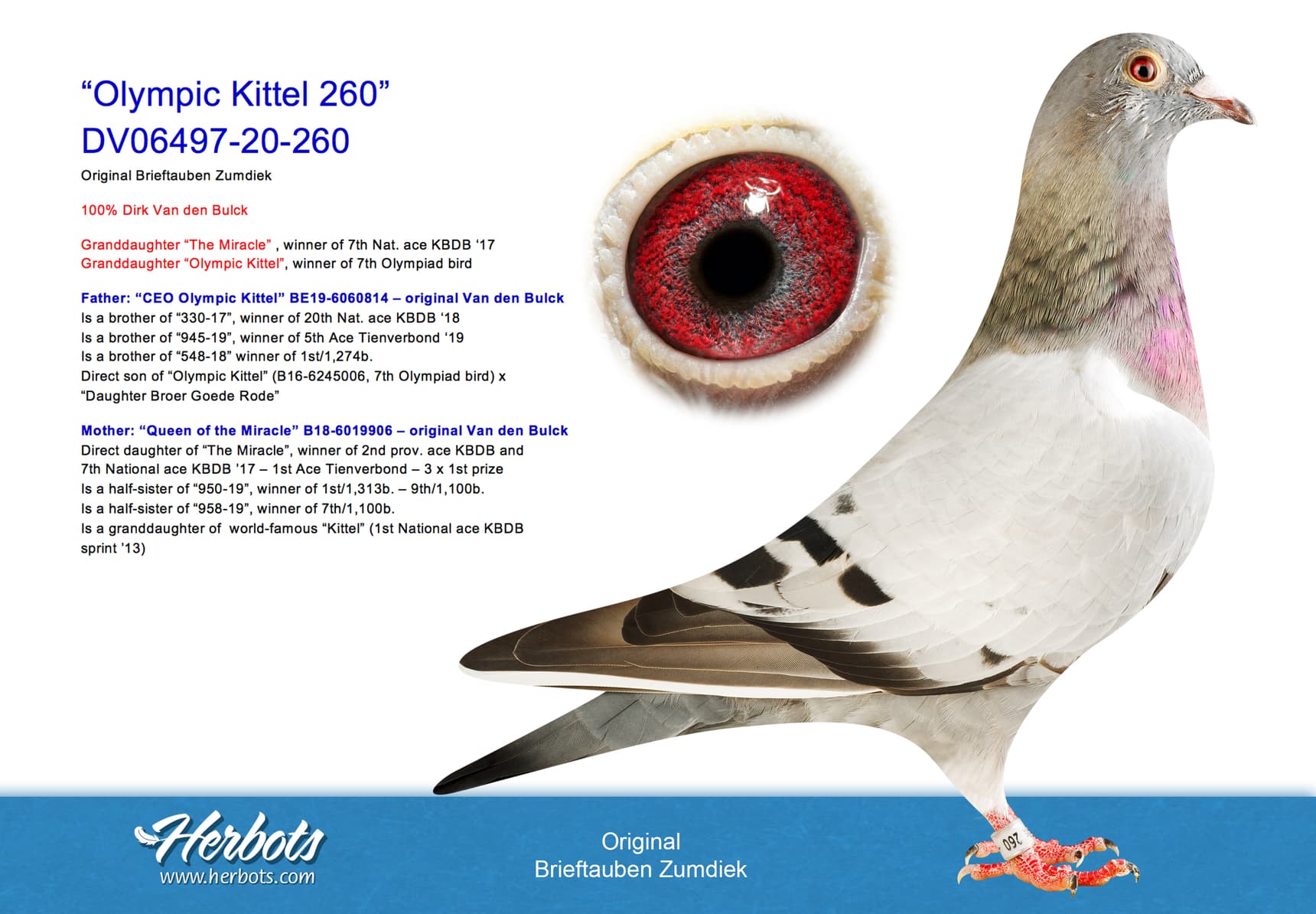 Direct son “White Man” x “Zuske 23” (full sister to “Olympic Wout” – Olympiad bird Polen Cat. F 2019)