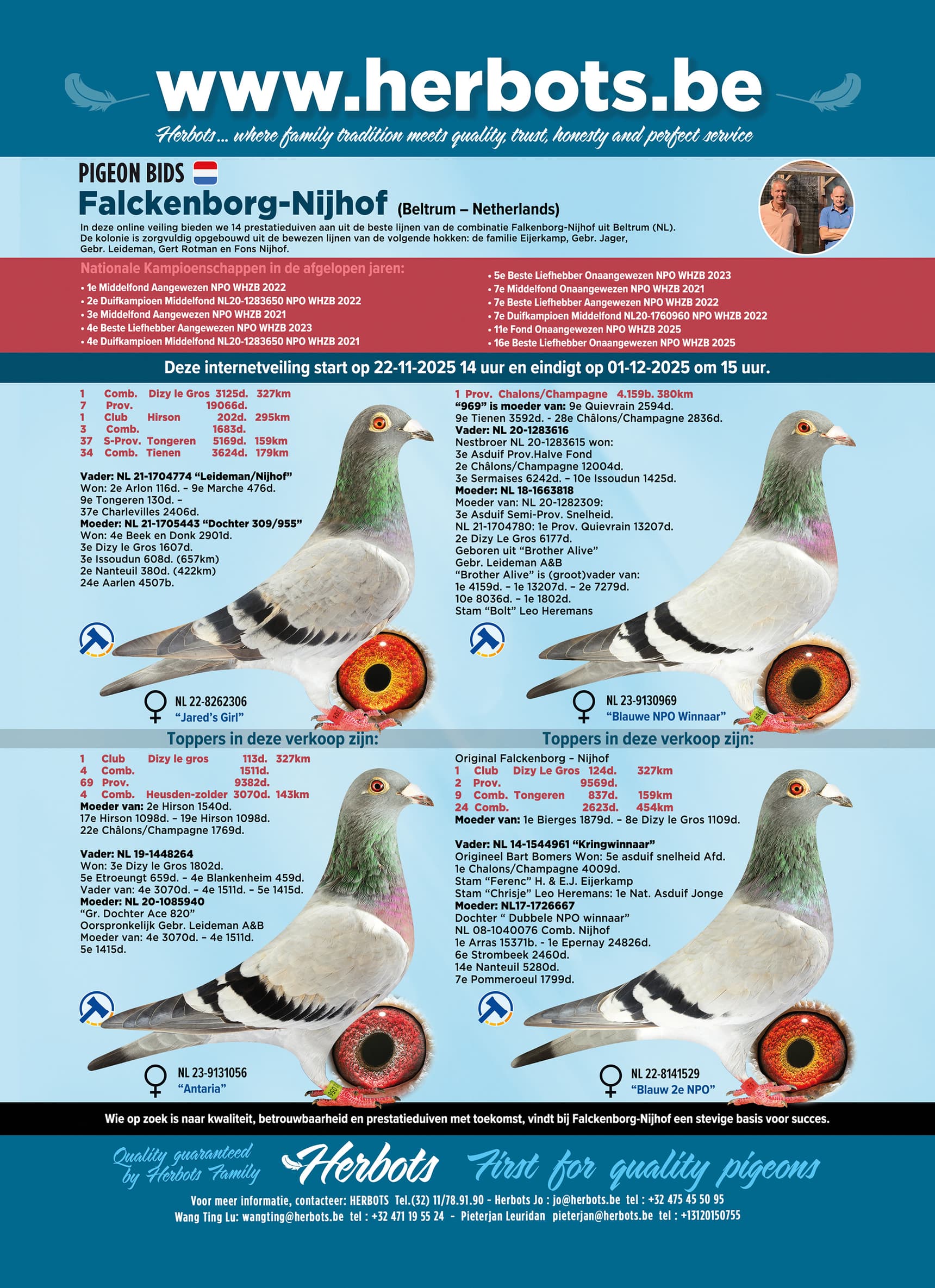 In deze online veiling bieden wij 14 prestatieduiven aan uit de beste lijnen van de combinatie Falkenborg-Nijhof uit Beltrum (NL). De kolonie is zorgvuldig opgebouwd uit de bewezen lijnen van de volgende hokken: de familie Eijerkamp, Gebr. Jager, Gebr. Leideman, Gert Rotman en Fons Nijhof. Wie op zoek is naar kwaliteit, betrouwbaarheid en prestatiegerichte duiven met toekomst, vindt bij Falckenborg-Nijhof een sterke basis voor succes.
