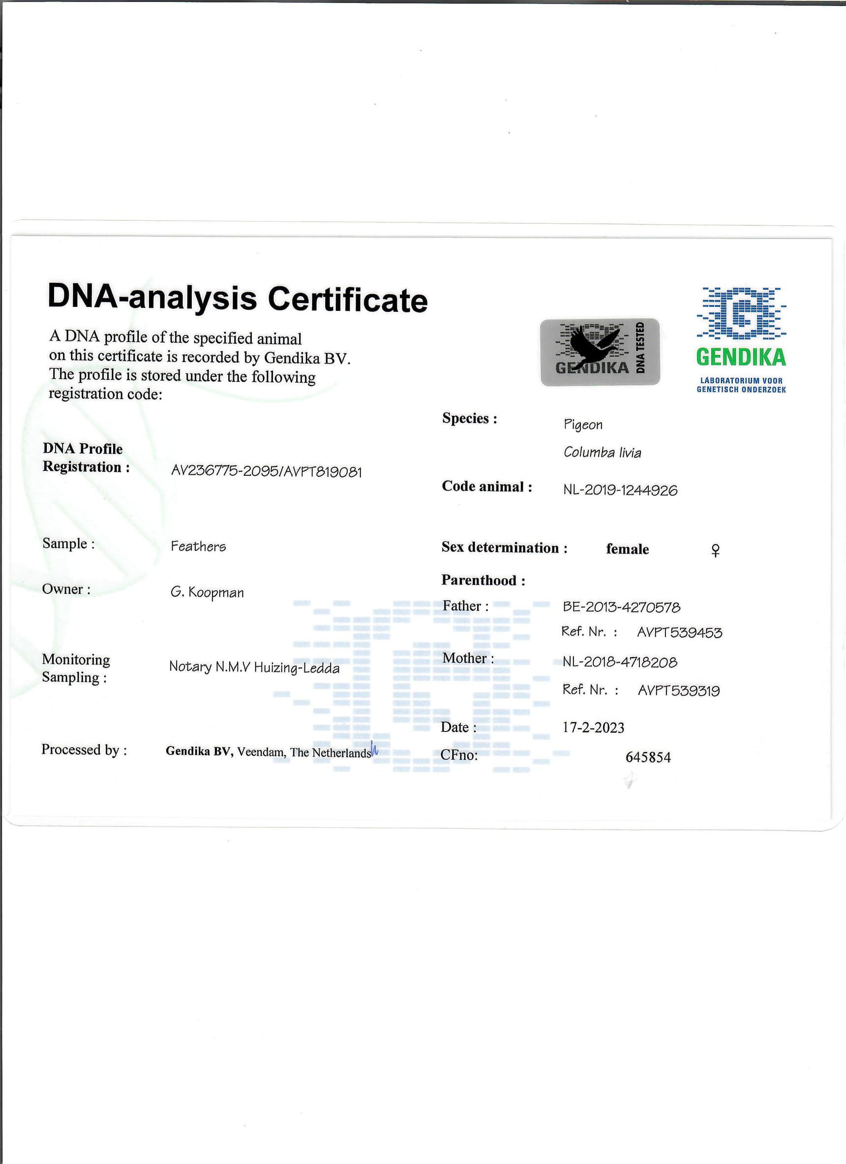 Double granddaughter champion breeder “Bjarne” (son “Den Dromer” – De Rauw-Sablon)  x “Monique” (daughter “De Perpignan” – Marcel Aelbrecht)
